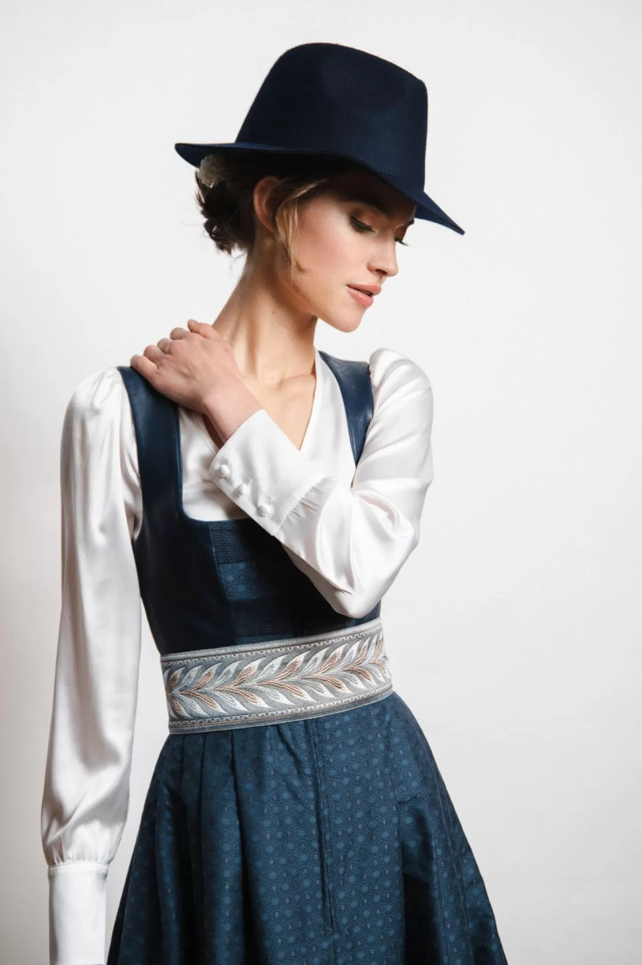 Das Oberteil dieses extravaganten Dirndls besteht aus Kunstleder wurde aus einem aufwendigen materialmix mit tonalen Stoffeinsätzen in der vorderen Mitte mit Sorgfalt gefertigt. Das Oberteil des Dirndls ist mit einer Paspel am Ausschnitt versehen und hat einen verdecktem Reißverschluss mit edlem Herzanhänger und Schmuckperle in der vorderen Mitte. Der wunderbar schwingende Rock ist aus einer extravaganten Jacquard-Qualität in Falten gelegt und hat eine handgewebte Jacquard-Borte am Saum. Die Schürze und das Schürzenband bestehen aus einem Jacquard-Mix mit 3D-Effekt. Der zusätzliche Gürtel hat eine handgewebten Jacquard-Borte. Der Gürtel lässt sich mit Haken und Ösen schließen. Der Fit: Oberteil körpernah