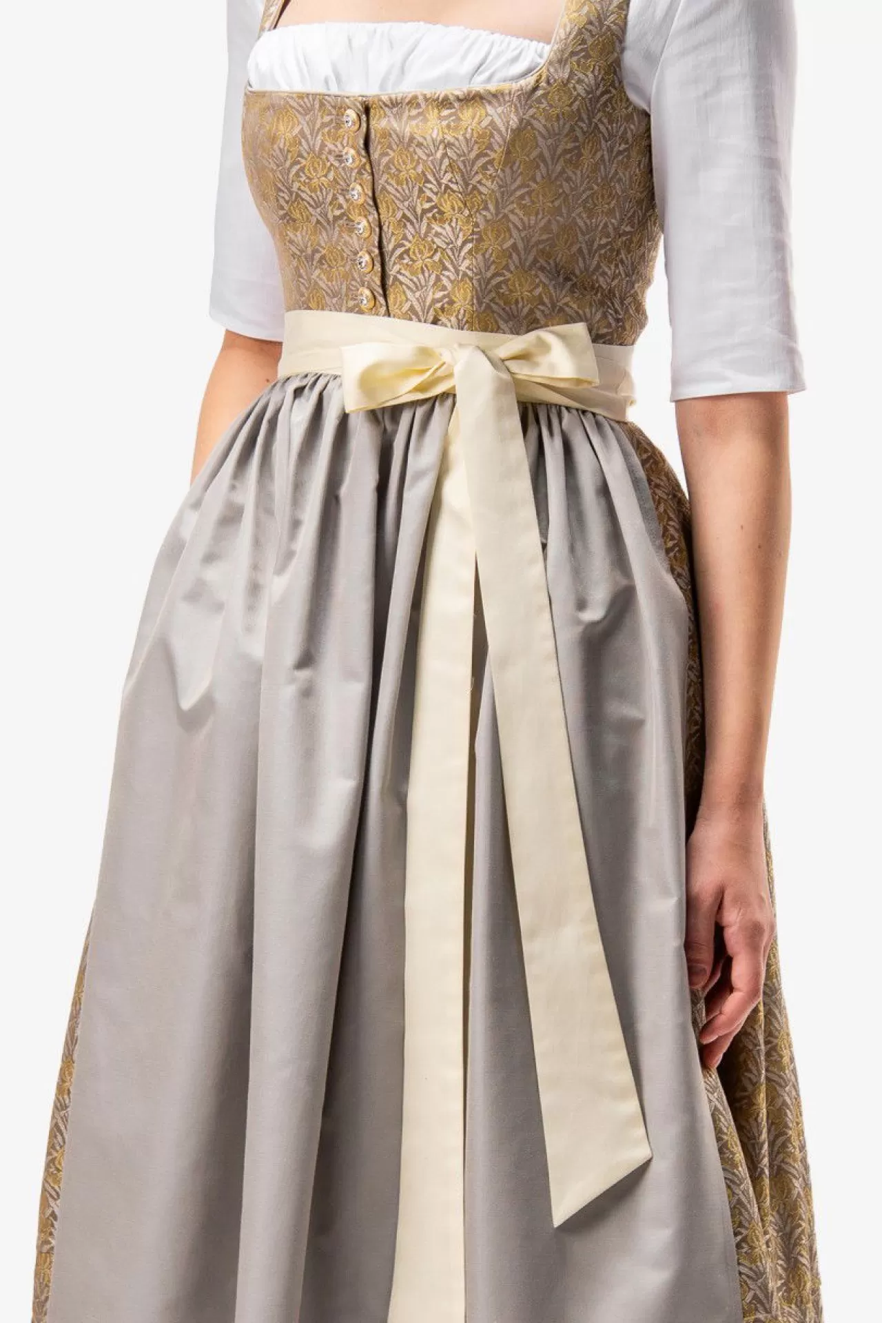 Erleben Sie pure Eleganz mit unserem exquisiten Dirndl aus hochwertigem Blumen-Jacquard. Der kunstvoll gefaltete Rock begeistert mit feinen Biesen und hochwertigen Borten entlang des Saums. Die einfarbige Schürze mit kontrastfarbigem Schürzenband verleiht eine subtile Raffinesse. Wunderschöne Metallknöpfe in der vorderen Mitte unterstreichen die traditionelle Note. Ein zusätzlicher Gürtel, geschmückt mit malerischen Borten und einem Hakenverschluss im Rücken, vervollständigt das anspruchsvolle Design dieses faszinierenden Ensembles.
