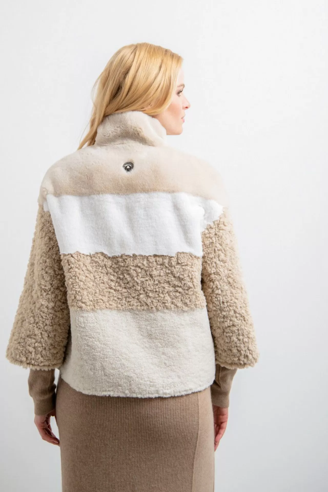 Die kurze Stehkragen-Jacke mit der lässigen Silhouette, der überschnittenen Schulter und den leicht verkürzten Ärmeln trägt sich super-bequem. Aber erst der Mix aus den verschiedenen Pelz- und Plüsch-Varianten macht die Jacke zu einem echten Hingucker. Im Vorderteil sind zwei Eingriffstaschen für die wichtigen Kleinigkeiten eingearbeitet und im Rückenteil ist unter dem Kragen eine hochwertige Sportalm-Niete platziert. Als Verschluss dient ein Zwei-Wege-Metallux-Reißverschluss in der vorderen Mitte. Die Jacke ist komplett gefüttert.