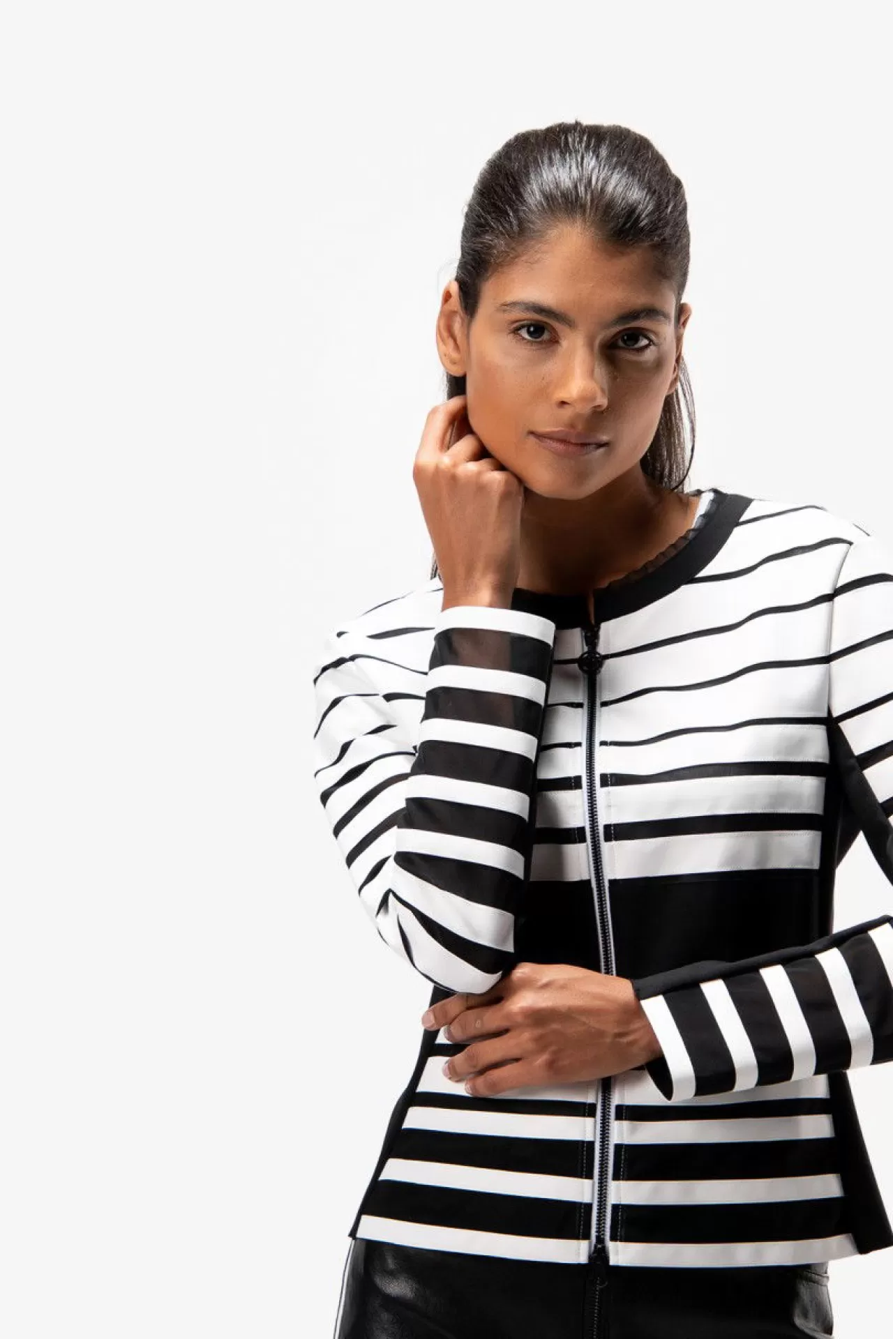 Raffiniert & absolut im Trend: die Lederjacke mit Rundhalsausschnitt im Colour-Blocking-Style. Das angesagte Colour-Blocking entsteht durch die weißen, aufgenähten Lederstreifen auf einem stabilen, schwarzen Netzuntergrund. Hoher Tragekomfort durch die hochwertige Scuba-Qualität im Rücken und der Ärmelunterseite. Used-Look durch die teilweise offenkantige Verarbeitung. Als Verschluss dient in der vorderen Mitte ein Zwei-Wege-Reißverschluss. Der Fit: feminine Silhouette