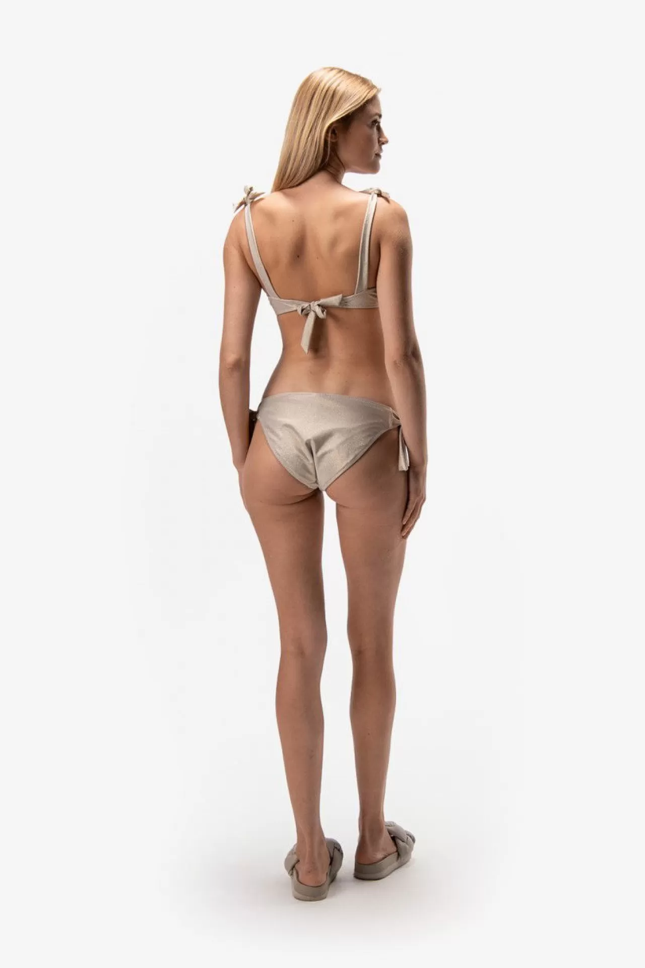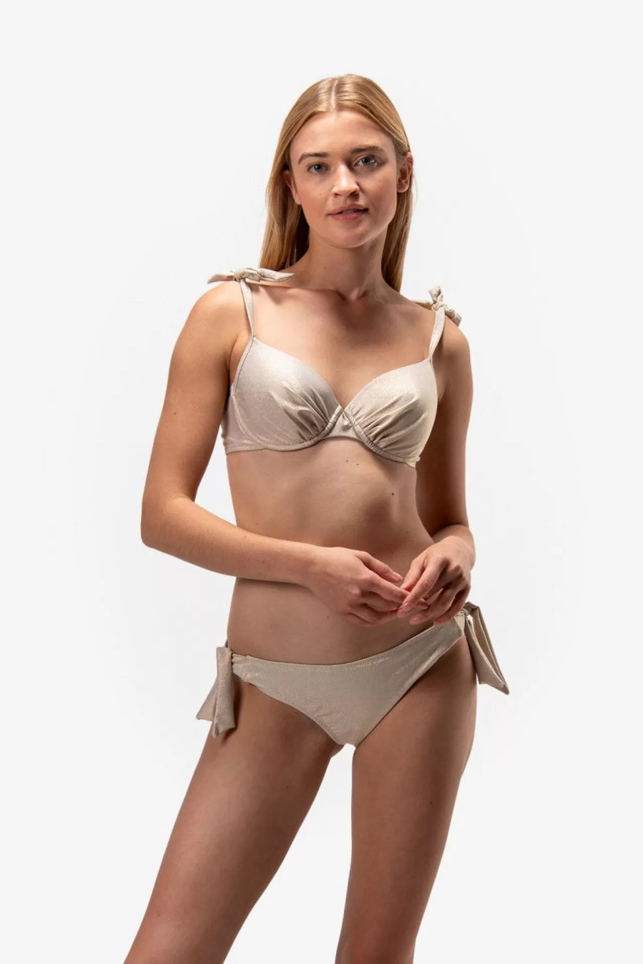 Für eine gute Figur am Strand: das Bikini-Oberteil mit Trägern zum Binden aus einer bedruckten Glitzer-Bikini-Qualitä…