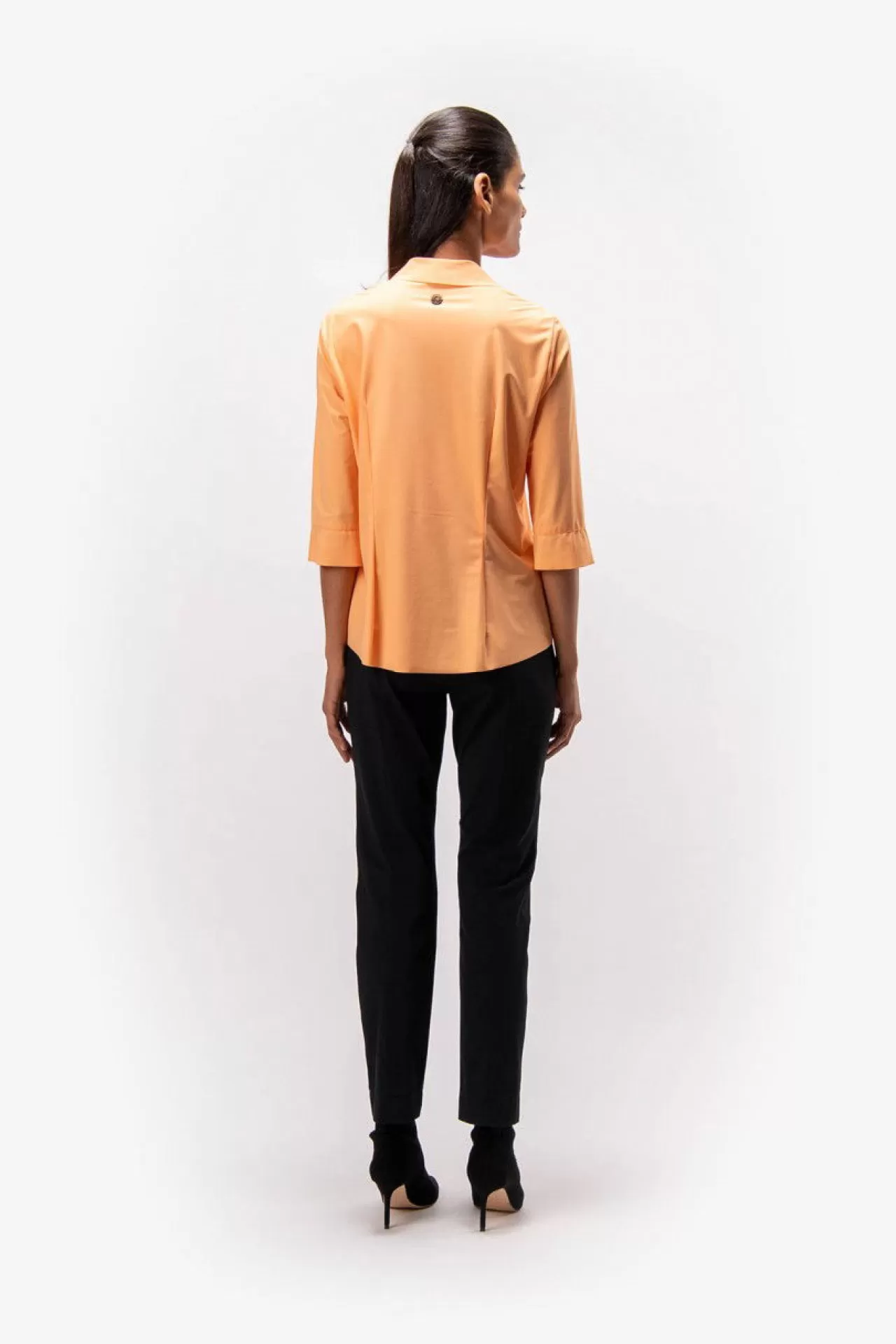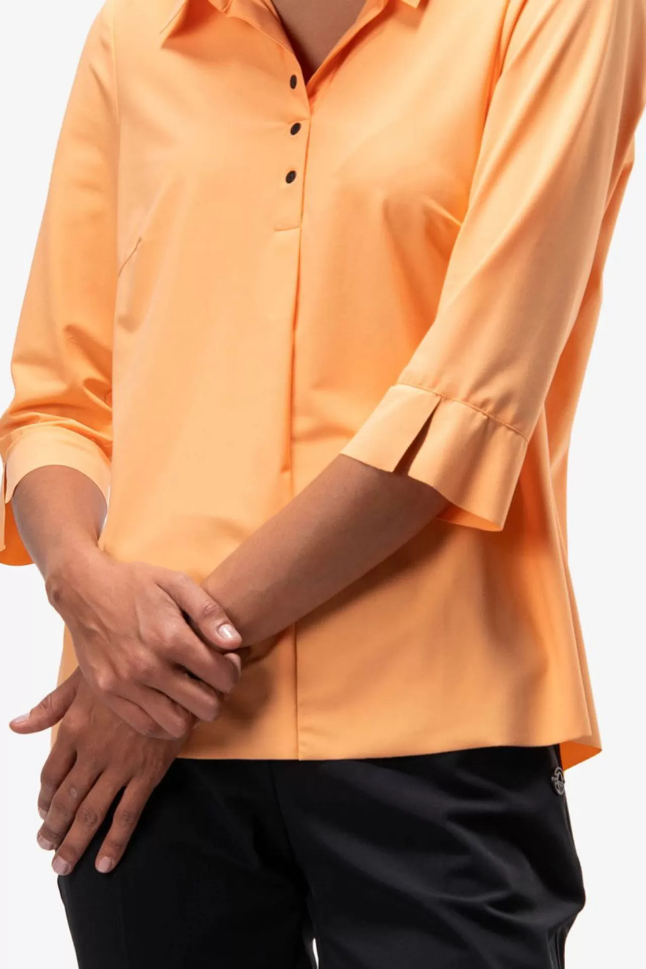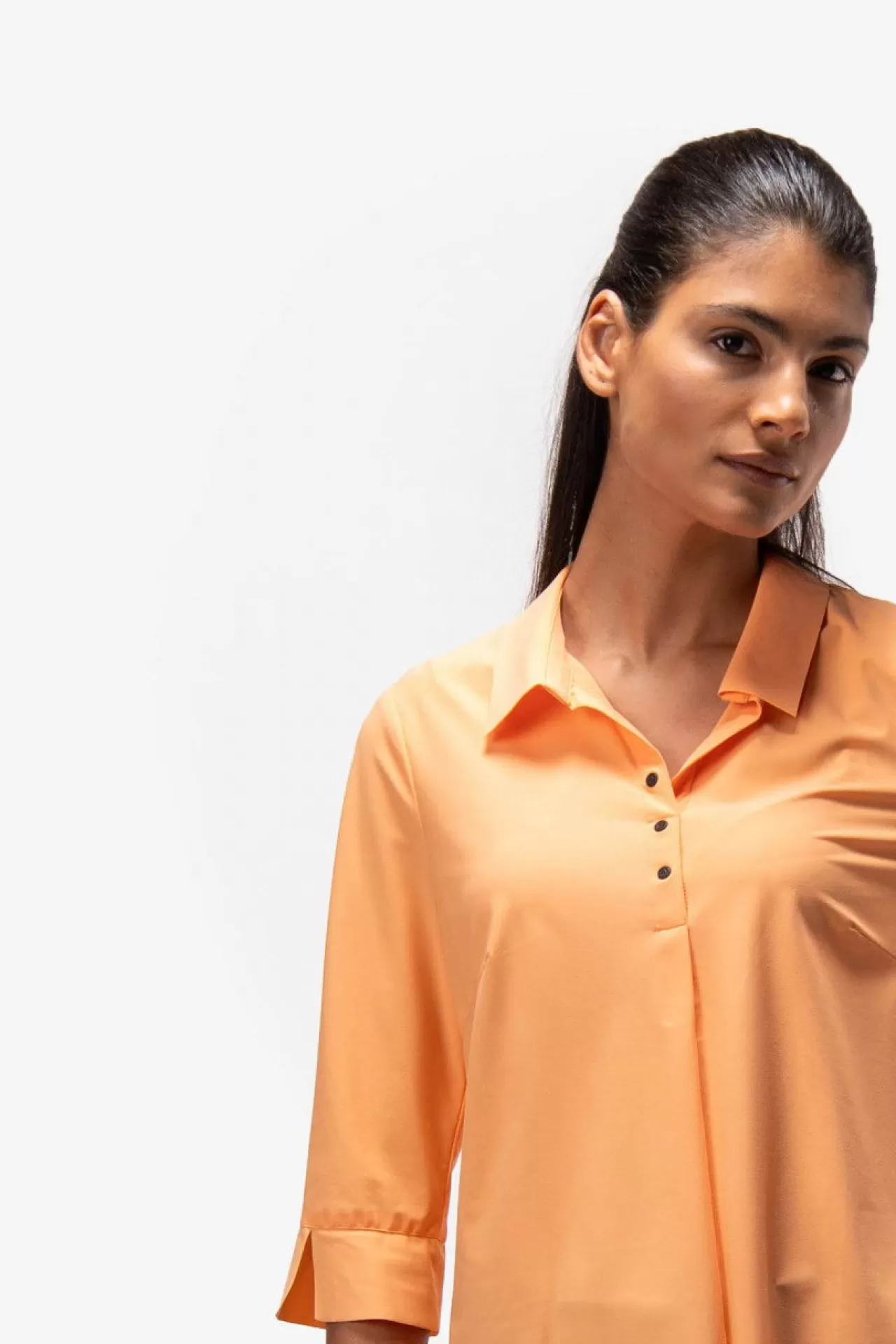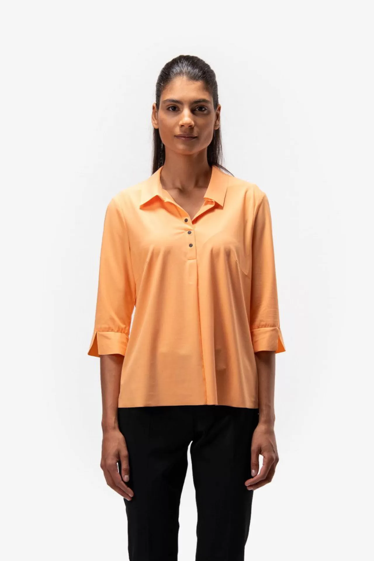 Für Poloshirts-Liebhaberinnen: diese Bluse im Poloshirt-Style mit verkürzten Ärmeln aus einer elastischen Jersey-Qualität. Kurze Leiste mit Druckknöpfen in der vorderen Mitte und eine Falte darunter für ein bequemes Anziehen. Der Saum ist gerundet und im Rückenteil leicht verlängert. Kanten im Raw-Edge-Style. Der Fit: körpernah