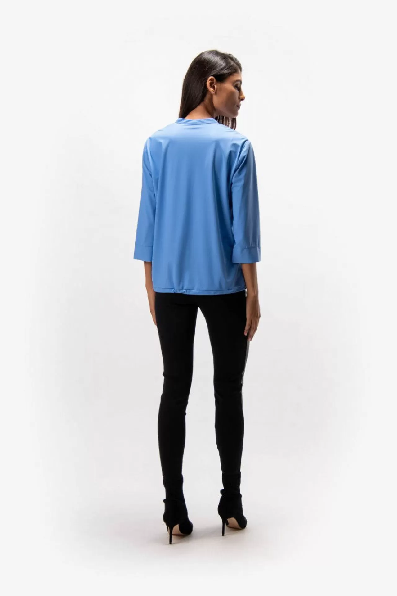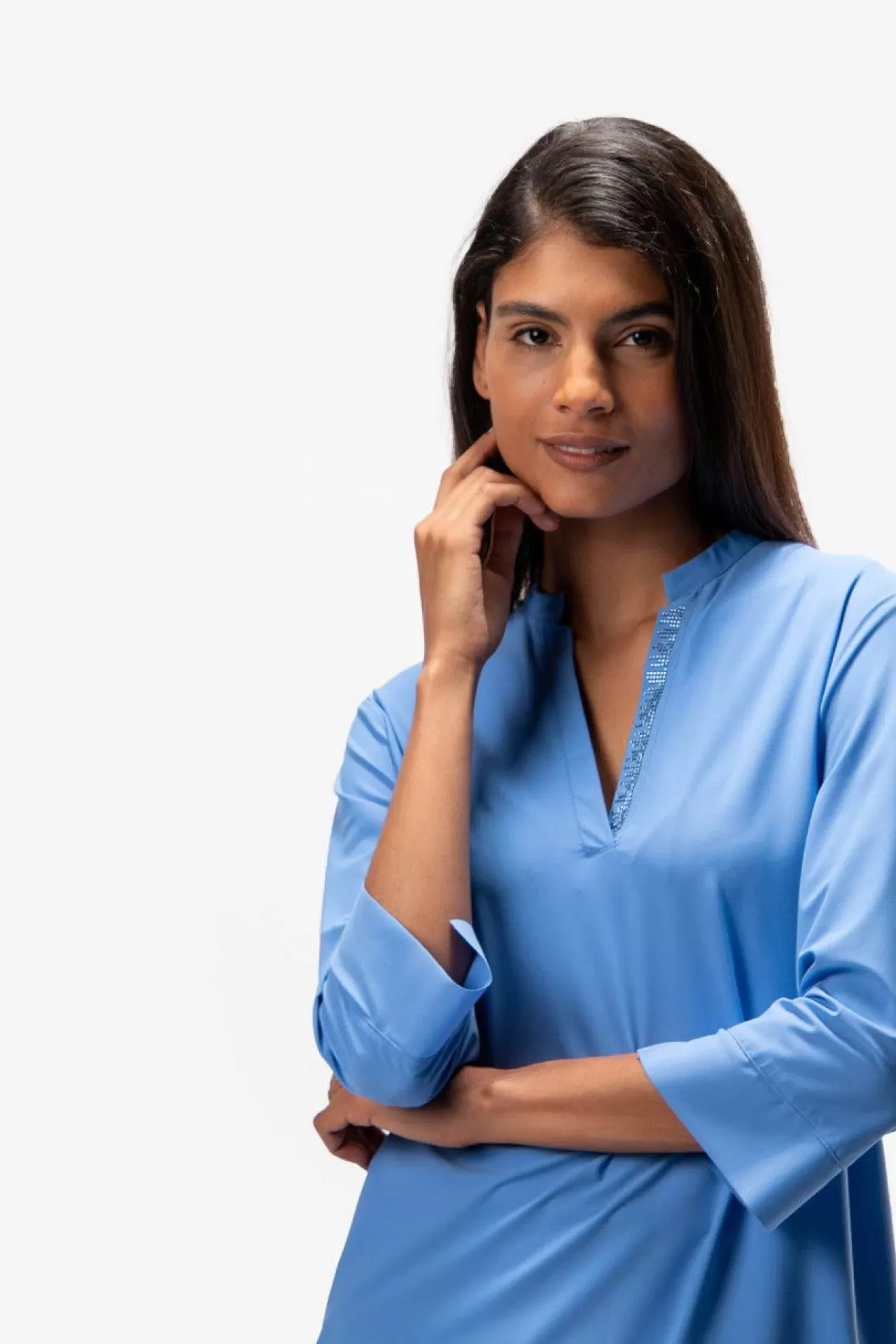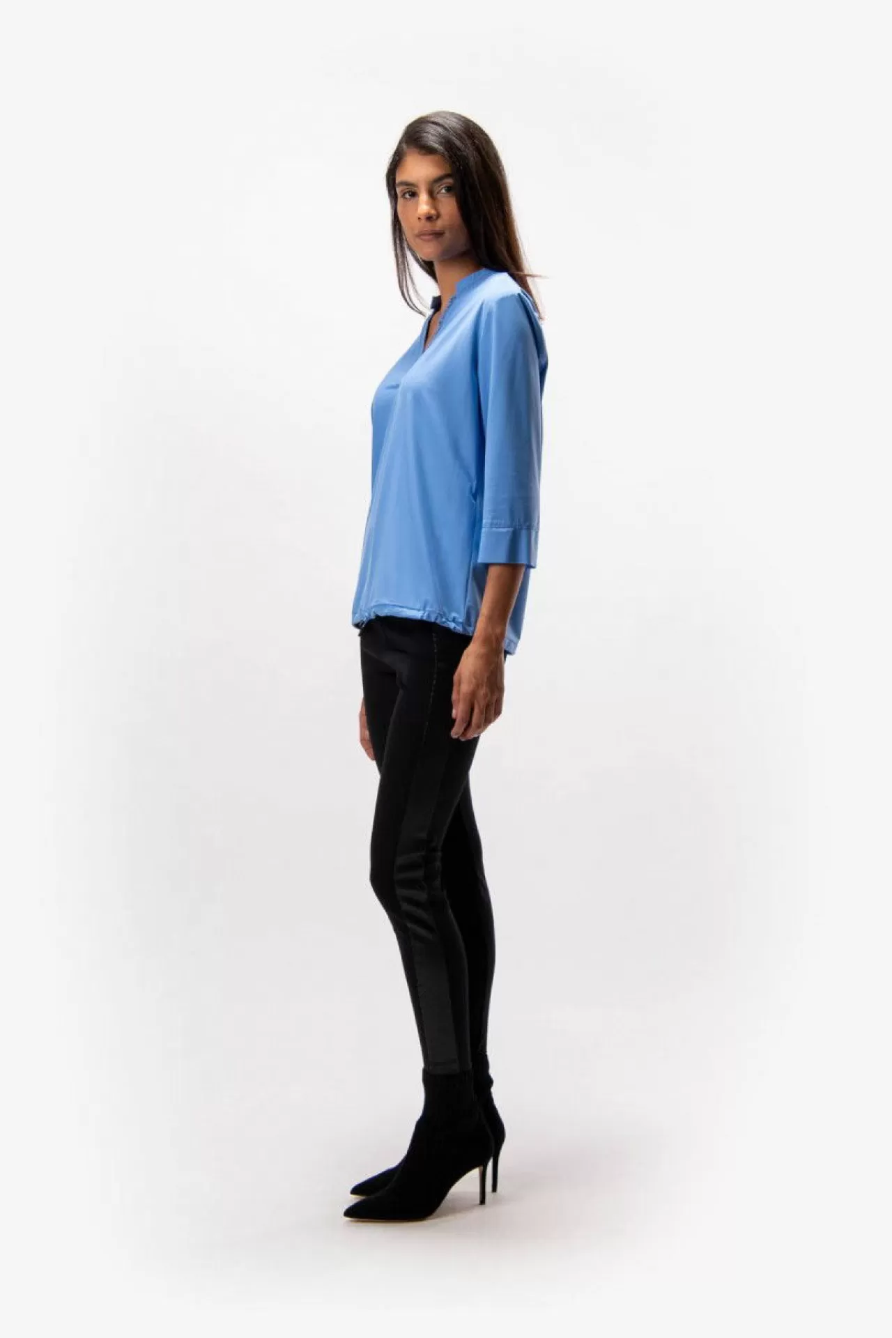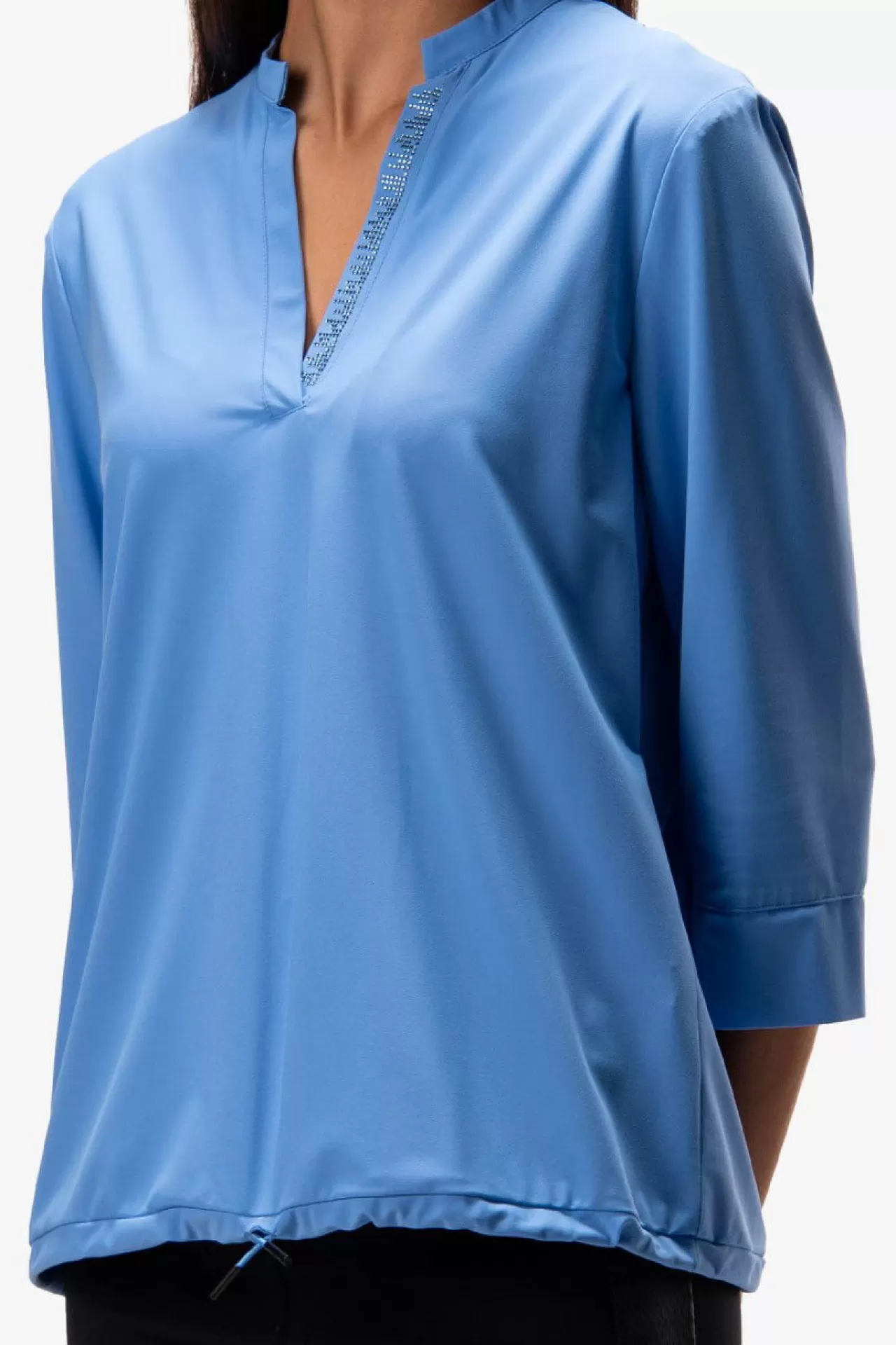 Bequem & chic: diese sommerliche Schlupfbluse mit Stehkragen und ¾-Arm aus einer leichten Jersey-Qualität. Den leichten V-Ausschnitt ziert ein tonales Strassstein-Motiv. Der Saum schließt mit eine Tunnelzug mit einer elastischen Kordel ab. Manschetten am Ärmelsaum im Opened-Edge-Look. Der Fit: sommerlich lässig