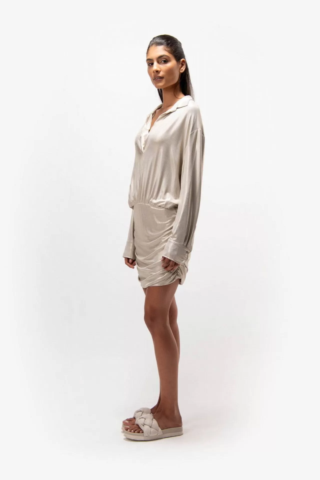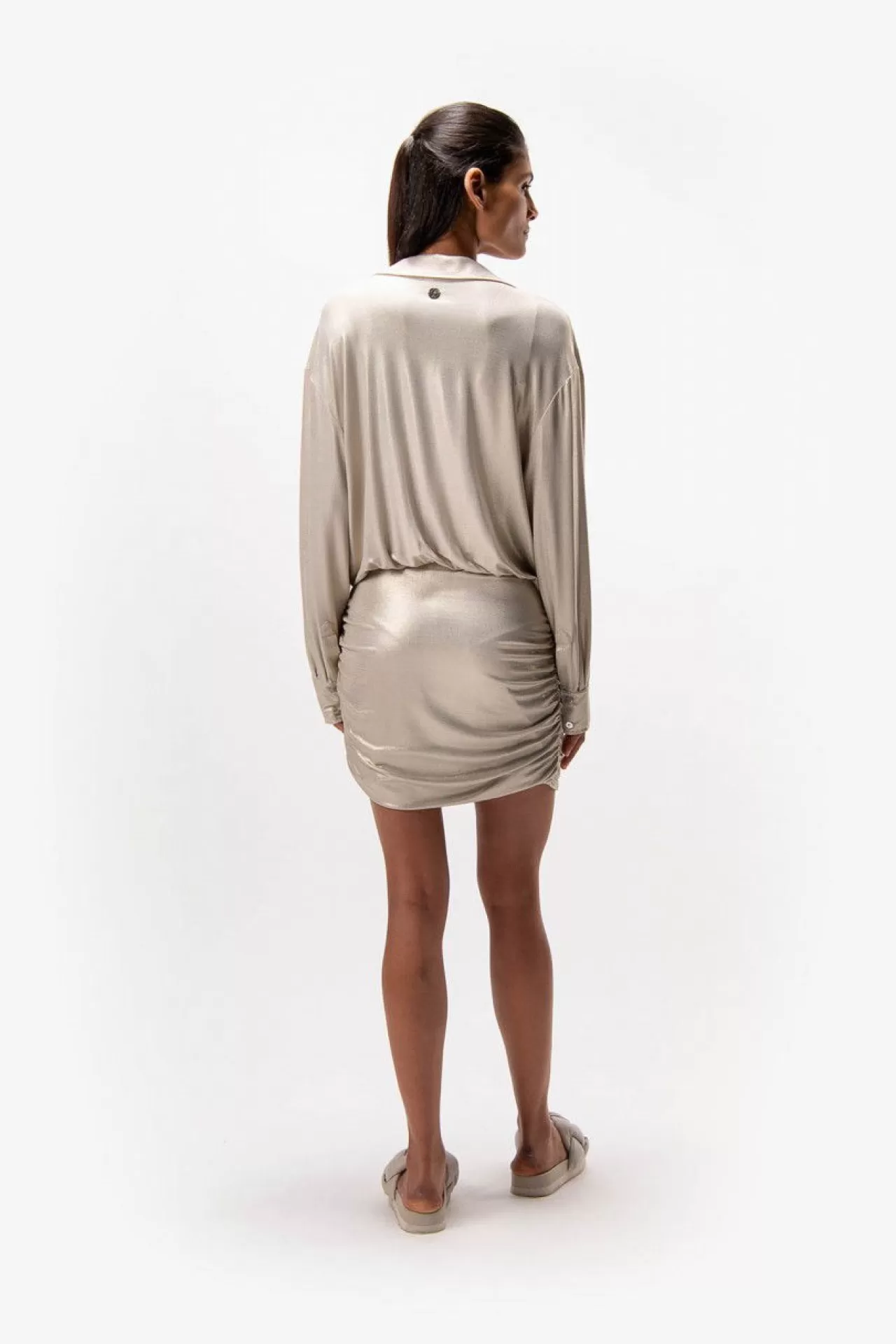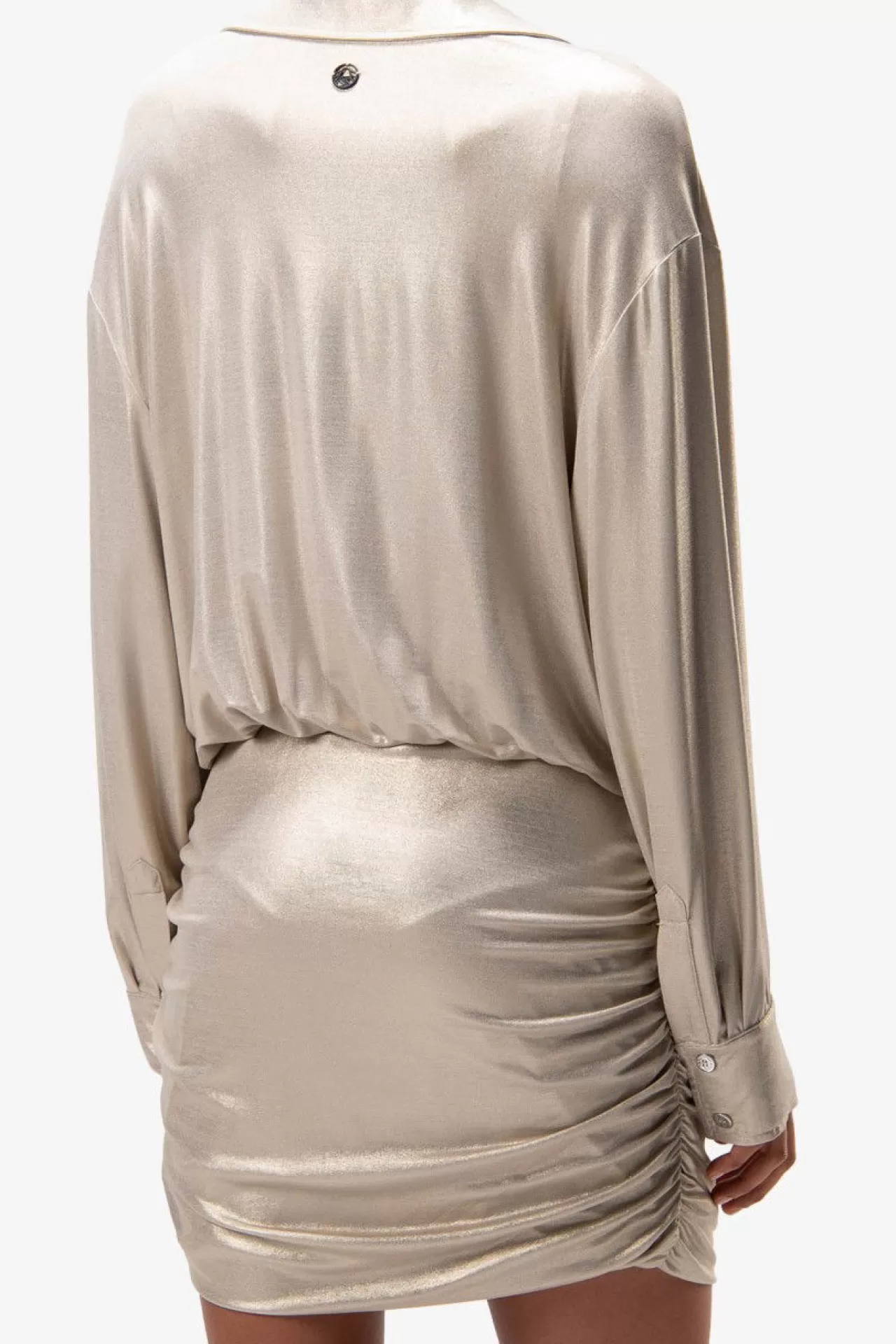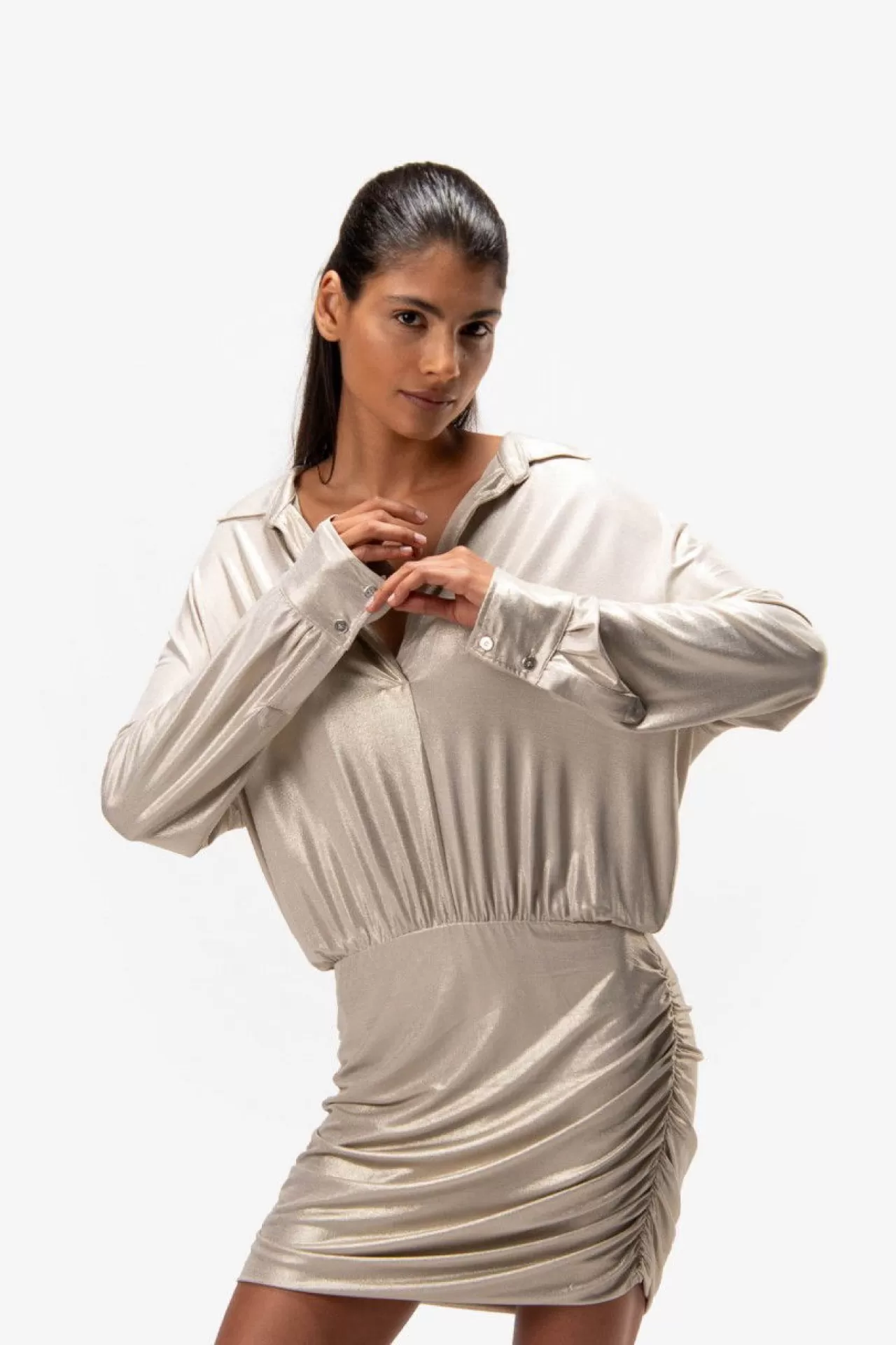 Sexy feminin: dieses Kleid mit Hemdblusenkragen mit Schlitz in der vorderen Mitte und langen Ärmeln aus einer glitzernden Viskose-Jersey-Qualität. Blusenartiges Oberteil und gerafftes Rockteil. Der Fit: körpernah