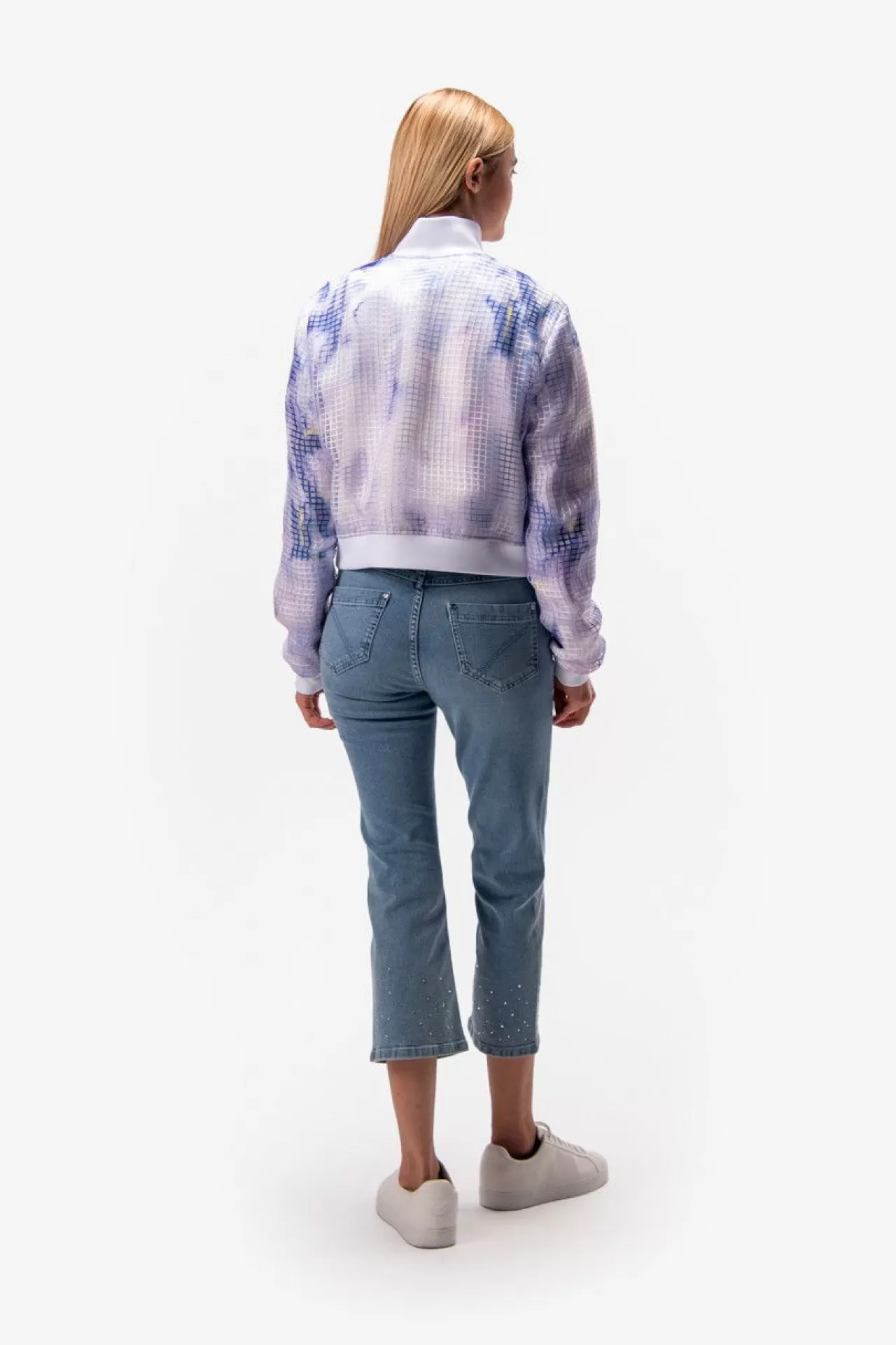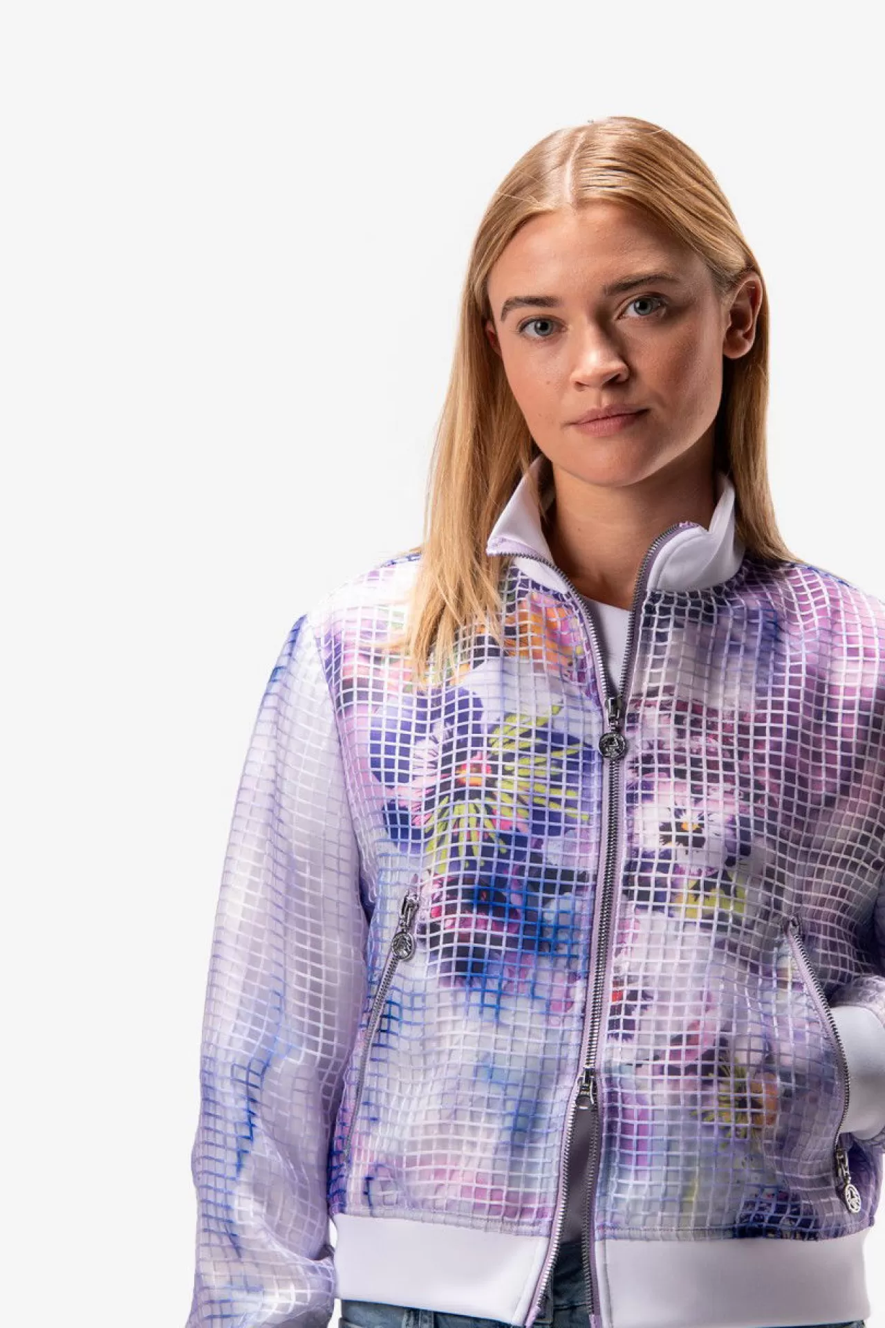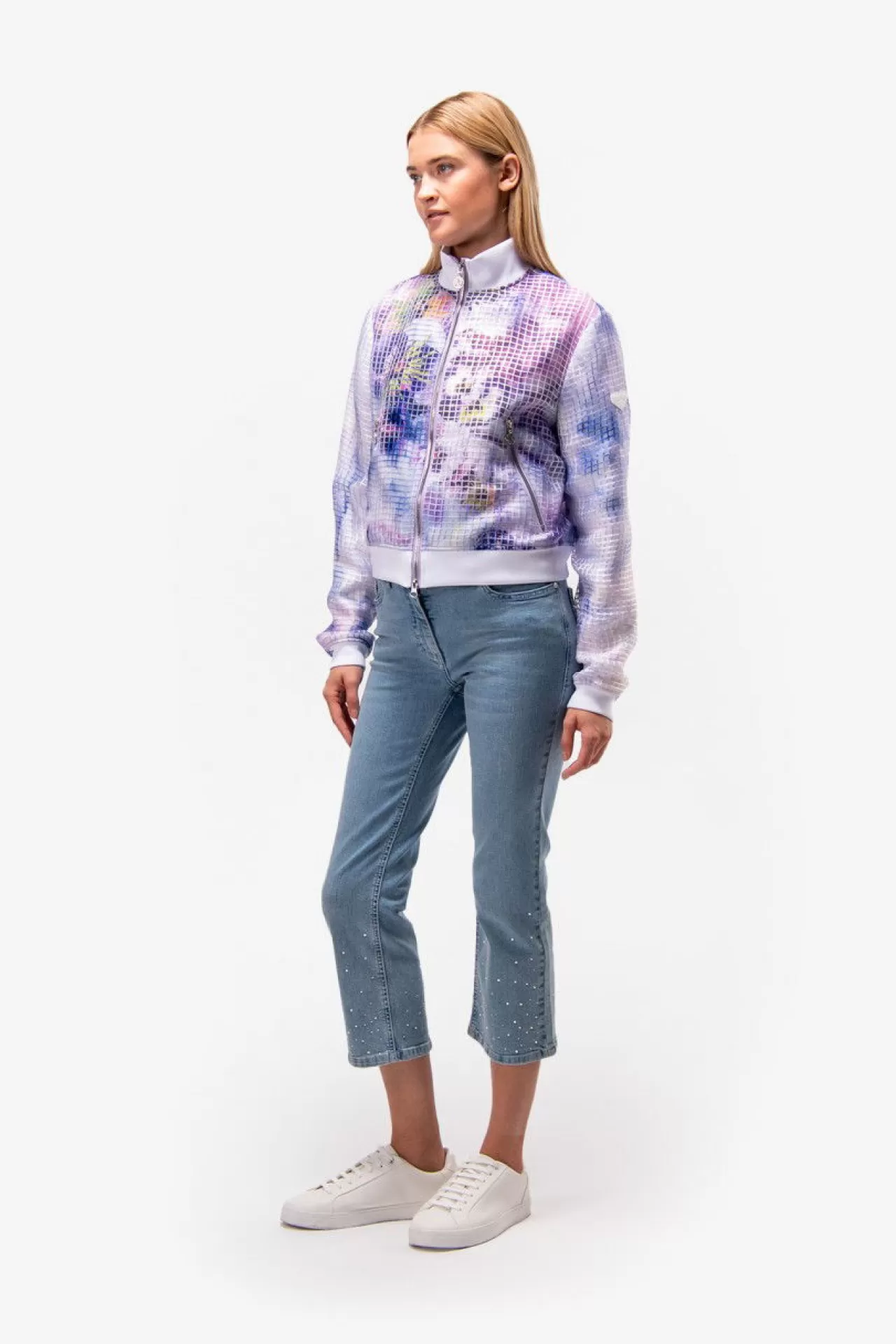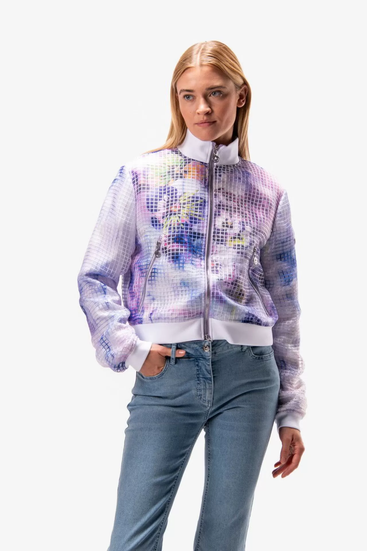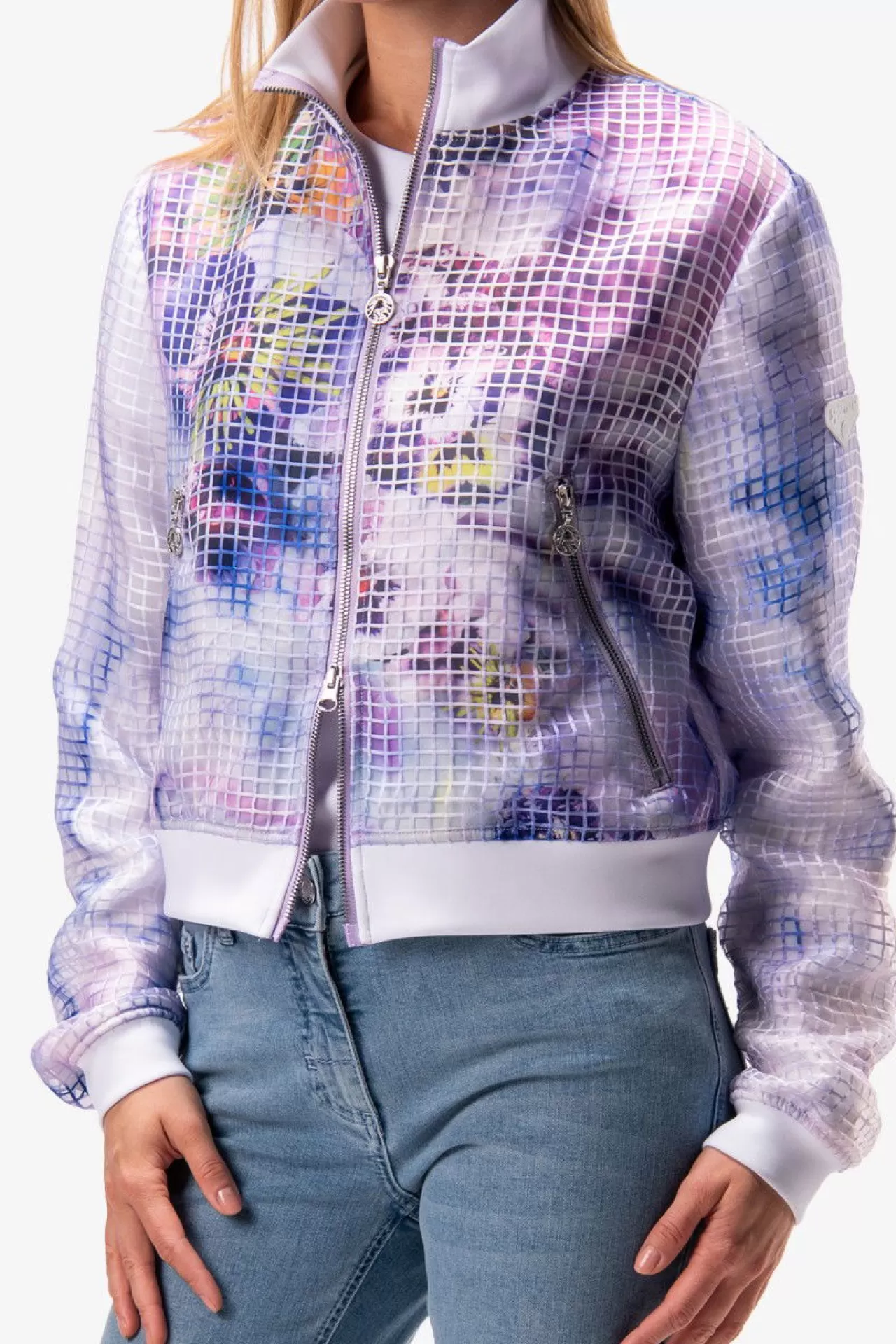 Luftig & transparent: die zweilagige Jacke mit Stehkragen aus einer angenehmen Sweat-Qualität mit einer transparenten Nylon-Qualität mit exklusivem Druck darüber. Die langen Ärmel schließen mit einem schmalen Bündchen ab und am Saum ist einen weicher Gummibund angesetzt. Im Vorderteil sind zwei Reißverschlusstaschen eingearbeitet. Als Verschluss dient ein Zwei-Wege-Reißverschluss in der vorderen Mitte. Der Fit: sportive Silhouette.