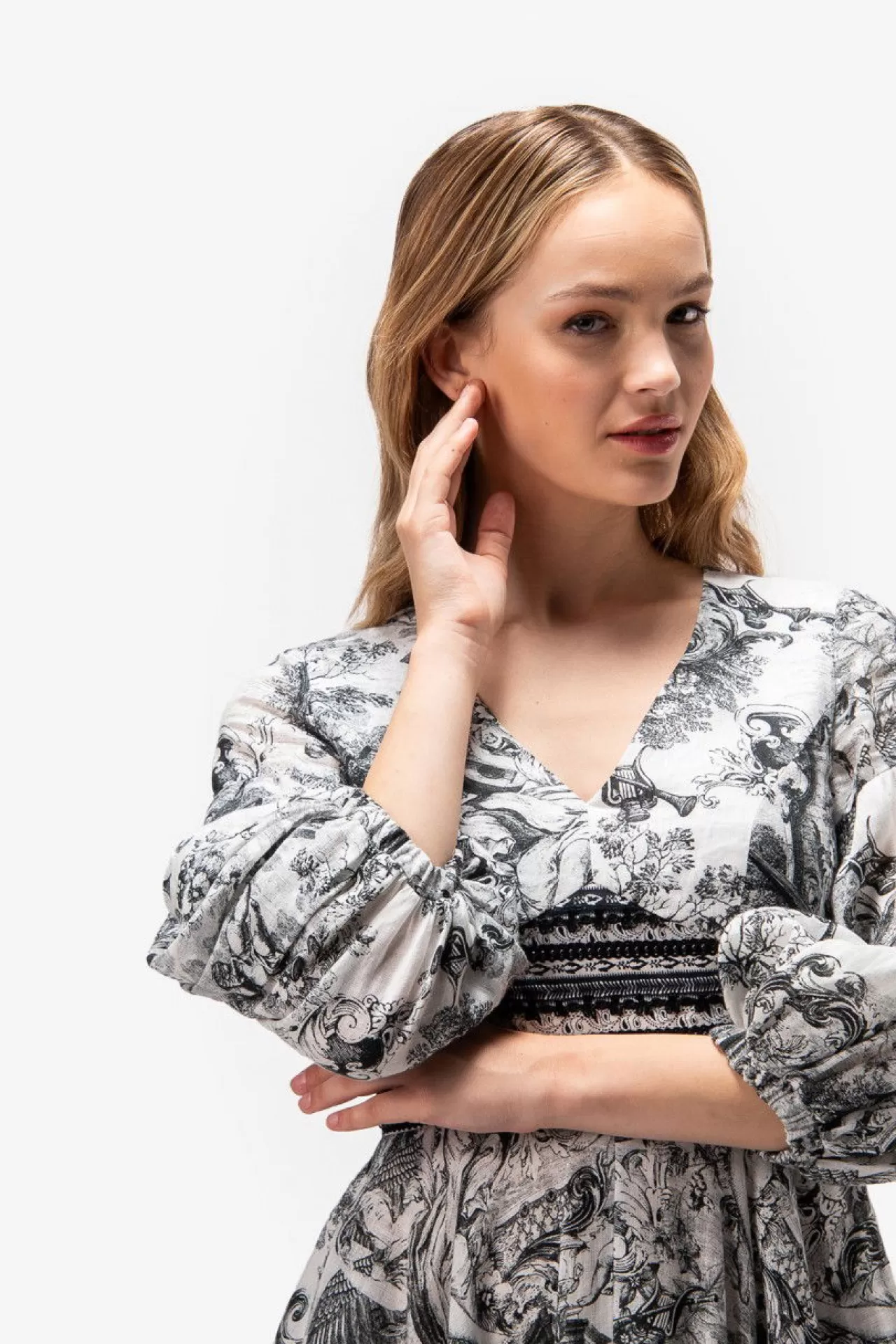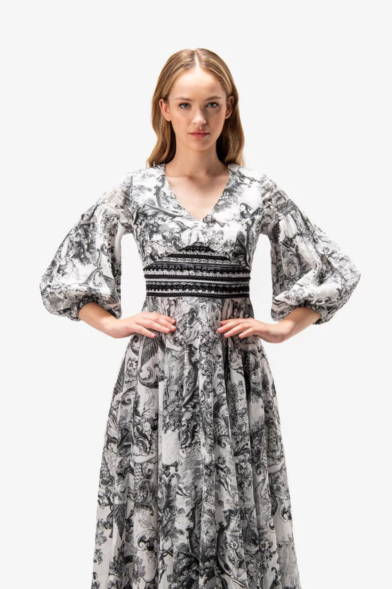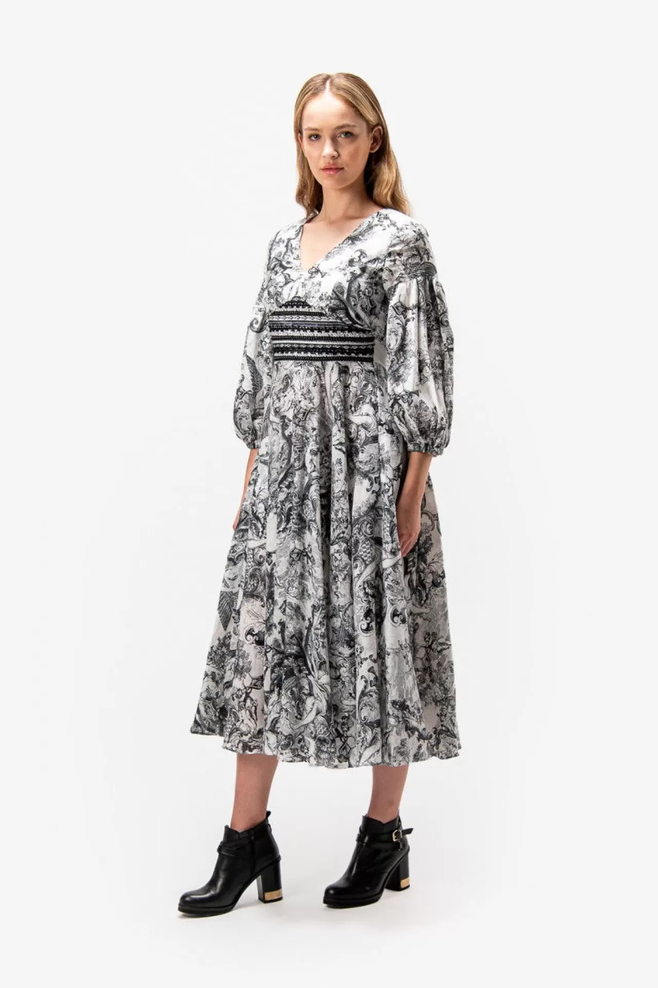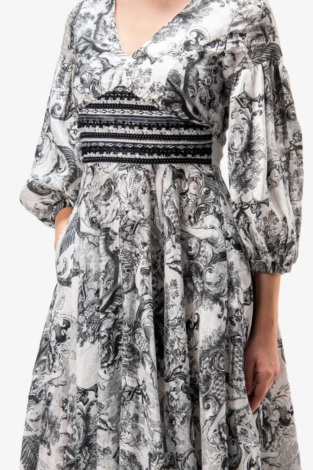 Unser wundervolles Kleid kombiniert einen bezaubernden Leinen-Druck mit gestreiften Baumwoll-Einsätzen, verziert mit feinen Borten in der Taille. Ein tiefer V-Ausschnitt und Ärmel mit Kräuselung im Oberarm, die mit einem weichen Gummiband abschließen, verleihen dem Kleid eine besondere Silhouette. Der märchenhaft schwingende Rock und die Eingriffstaschen in der Seitennaht bieten sowohl Stil als auch praktische Funktion. Ein nahtverdeckter Reißverschluss in der hinteren Mitte ermöglicht ein bequemes Anziehen. Das Kleid ist teilweise gefüttert für zusätzlichen Komfort.
