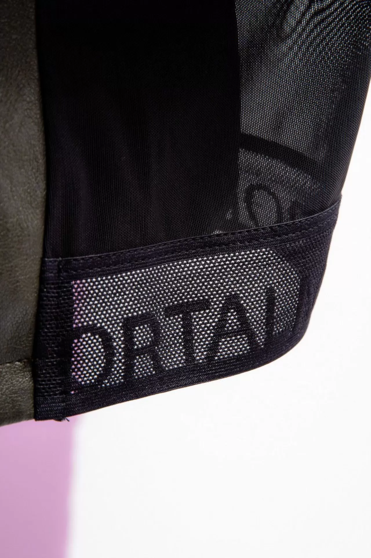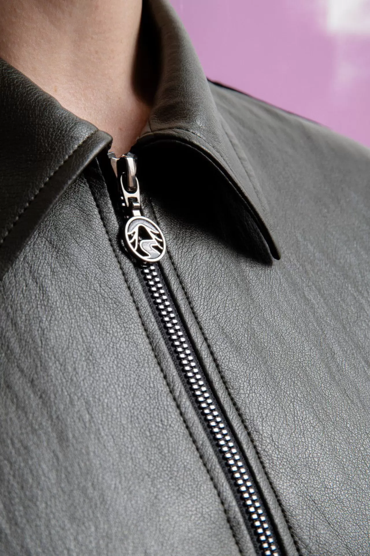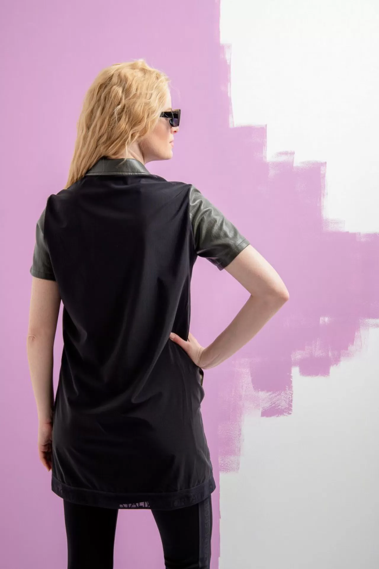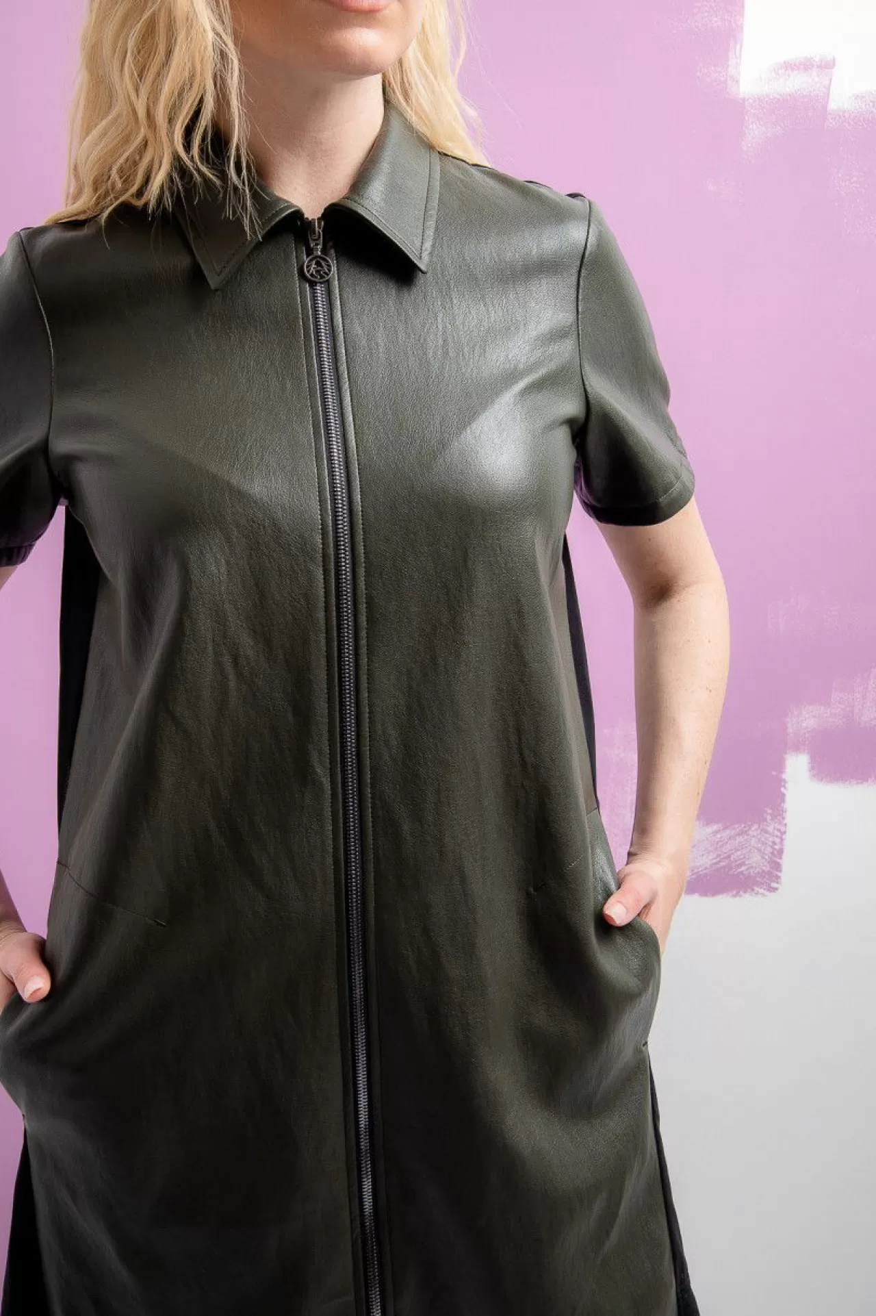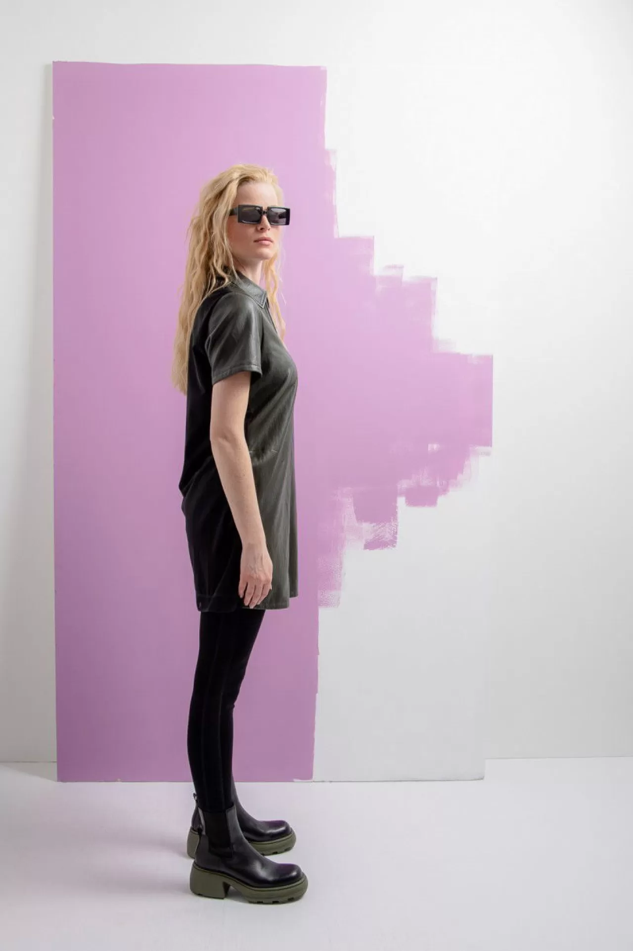 Ob als Kleid oder als Mantel – dieses legere Lederkleid mit den kurzen Ärmeln darf in keiner Garderobe fehlen. Das Vorderteil und die kurzen Ärmel sind aus seinem weichen Leder gearbeitet und stehen in einem interessanten Kontrast zur transparenten Tüll-Qualität im Rücken. Um das Rückenteil blickdichter zu gestalten, wurde die Tüll-Ware doppelt verarbeitet und zusätzlich unterlegt. In der Seitennaht sind zwei Eingriffstaschen für die wichtigen Kleinigkeiten eingearbeitet. Am Saum im Rückenteil ist der weiche, logoverzierte Gummibund angesetzt. Der Hemdkragen aus Leder schließt den modischen Look perfekt ab.