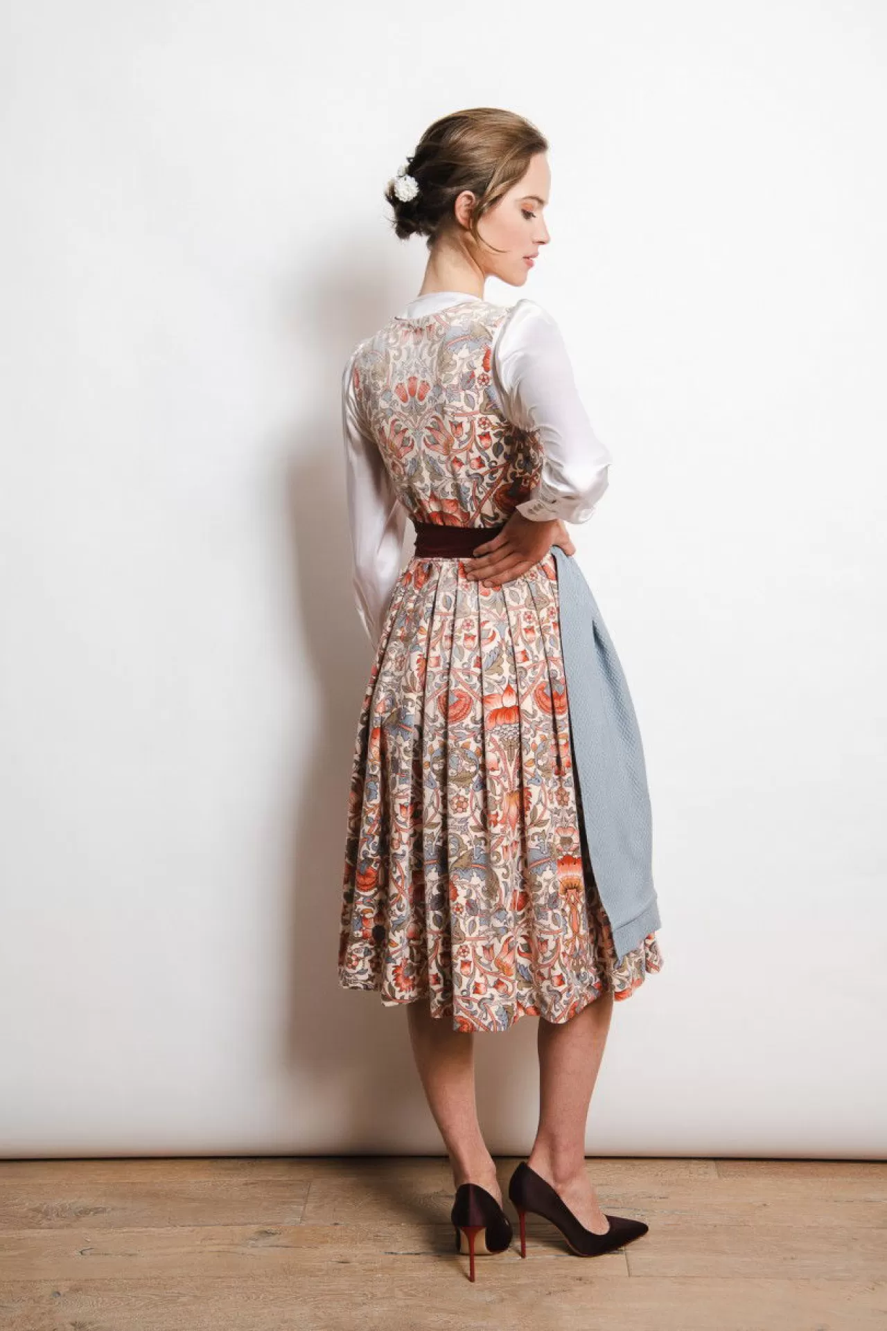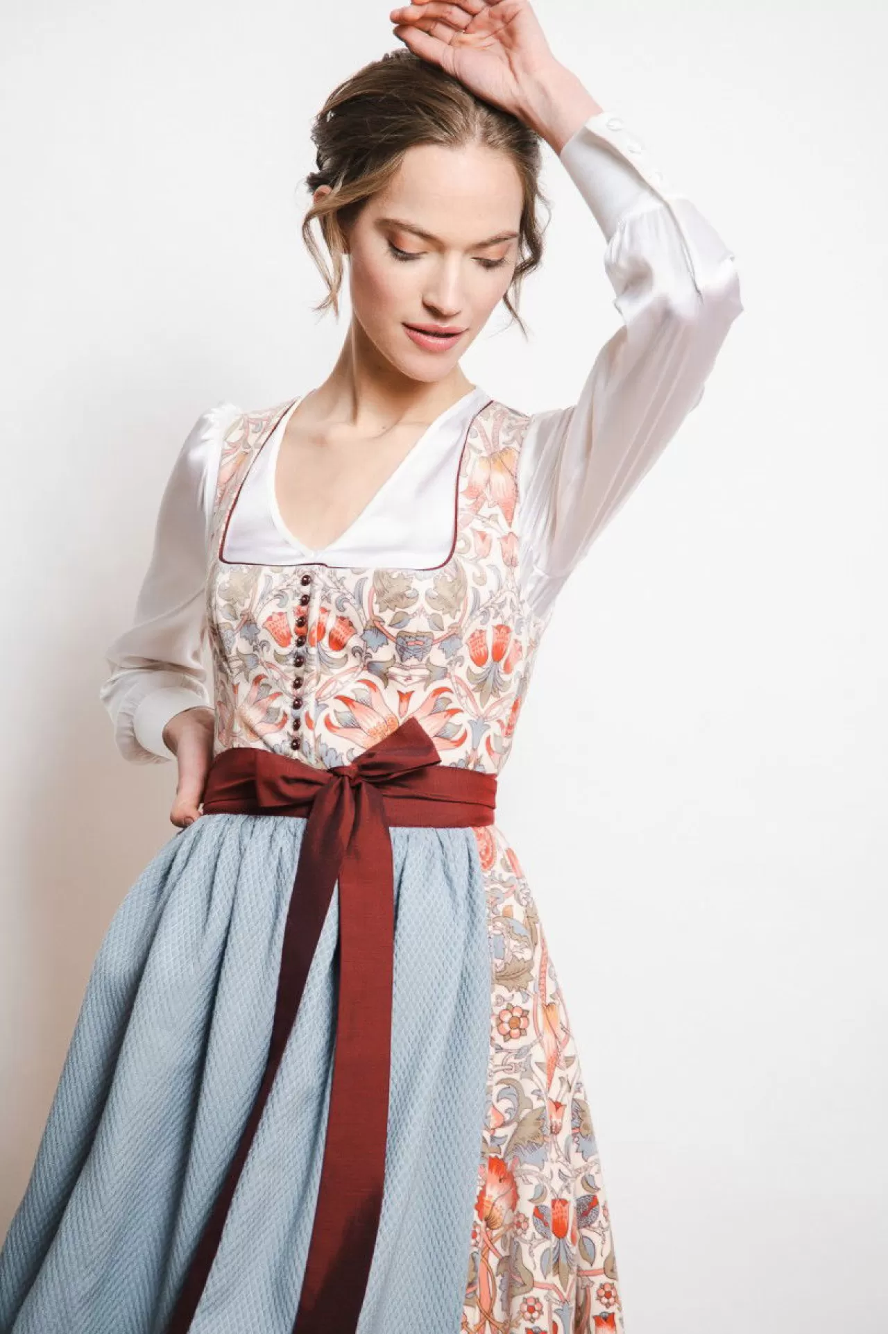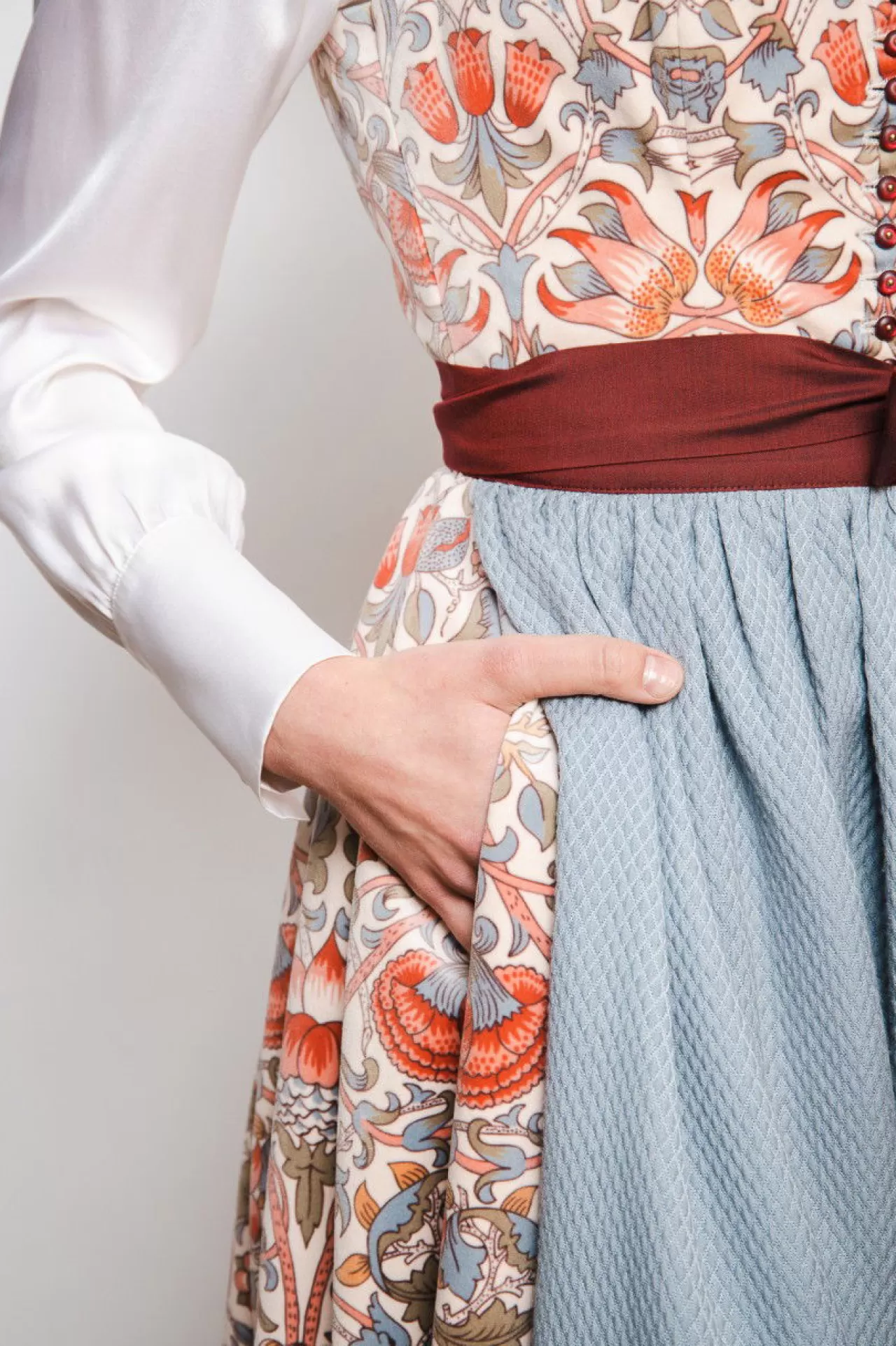 Das Allover-Samtdirndl mit nostalgischem Muster ist perfekt für jeden Anlass. Der Faltenrock umspielt die Figur durch den schwereren Samt besonders schön und wirkt gleichzeitig sehr modern in der Midi Länge. Die Schürze ist dreidimensional aus einem super weichen Jacquard gewebt. Das Schürzenband ist aus einem Seidenmix und setzt den perfekten Farbkontrast, der sich auch in der Paspel am Ausschnitt und den Knöpfen wieder findet. Der Fit: Oberteil körpernah.