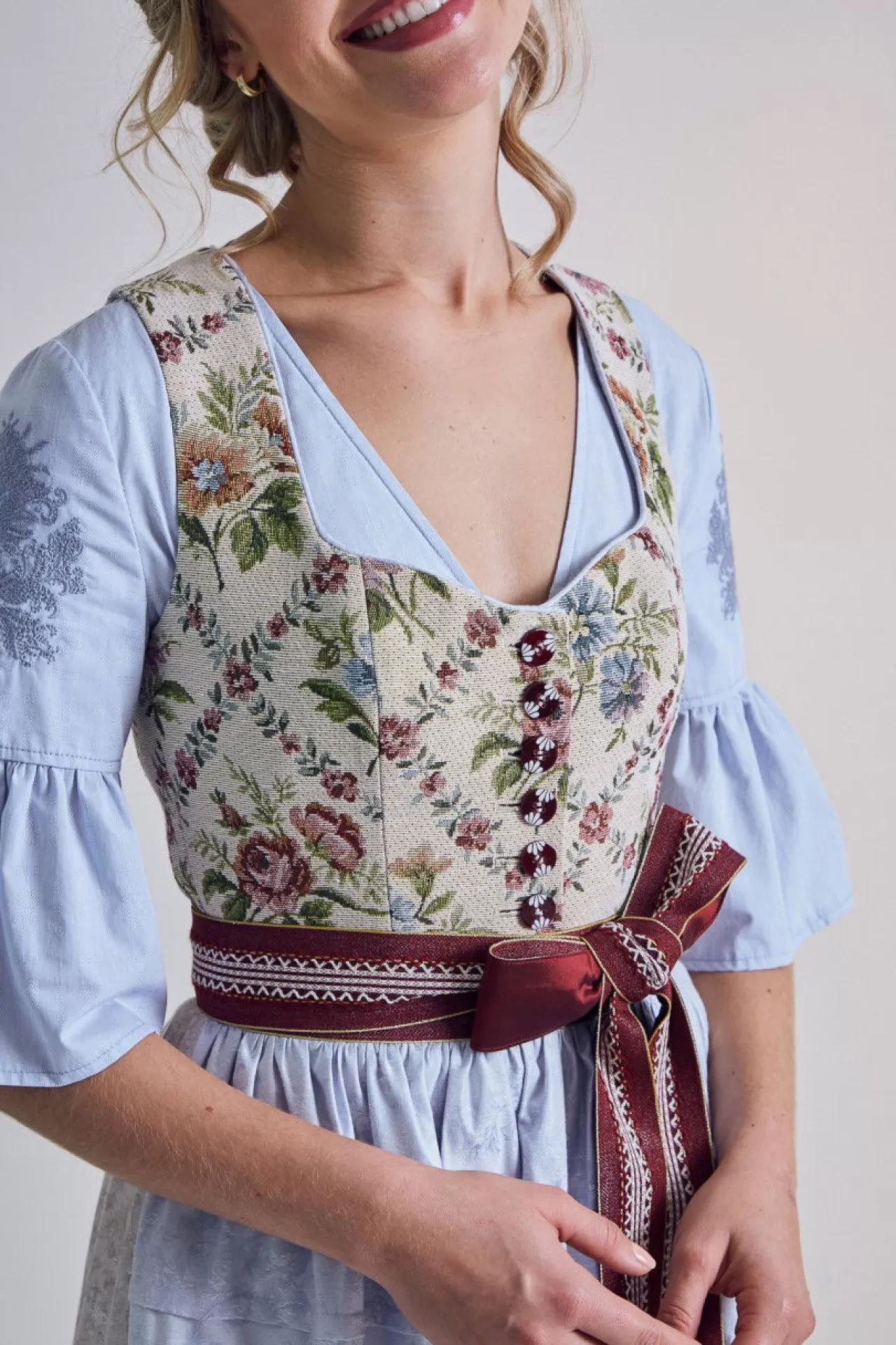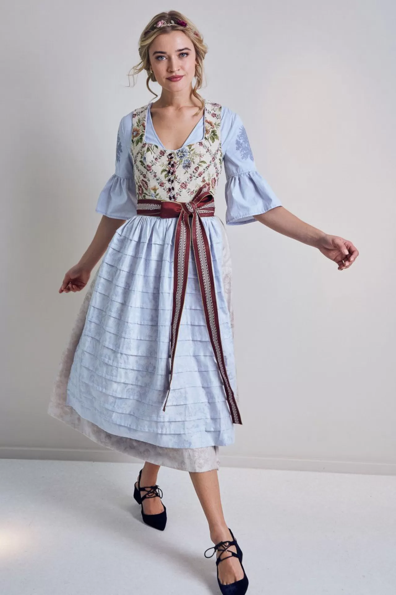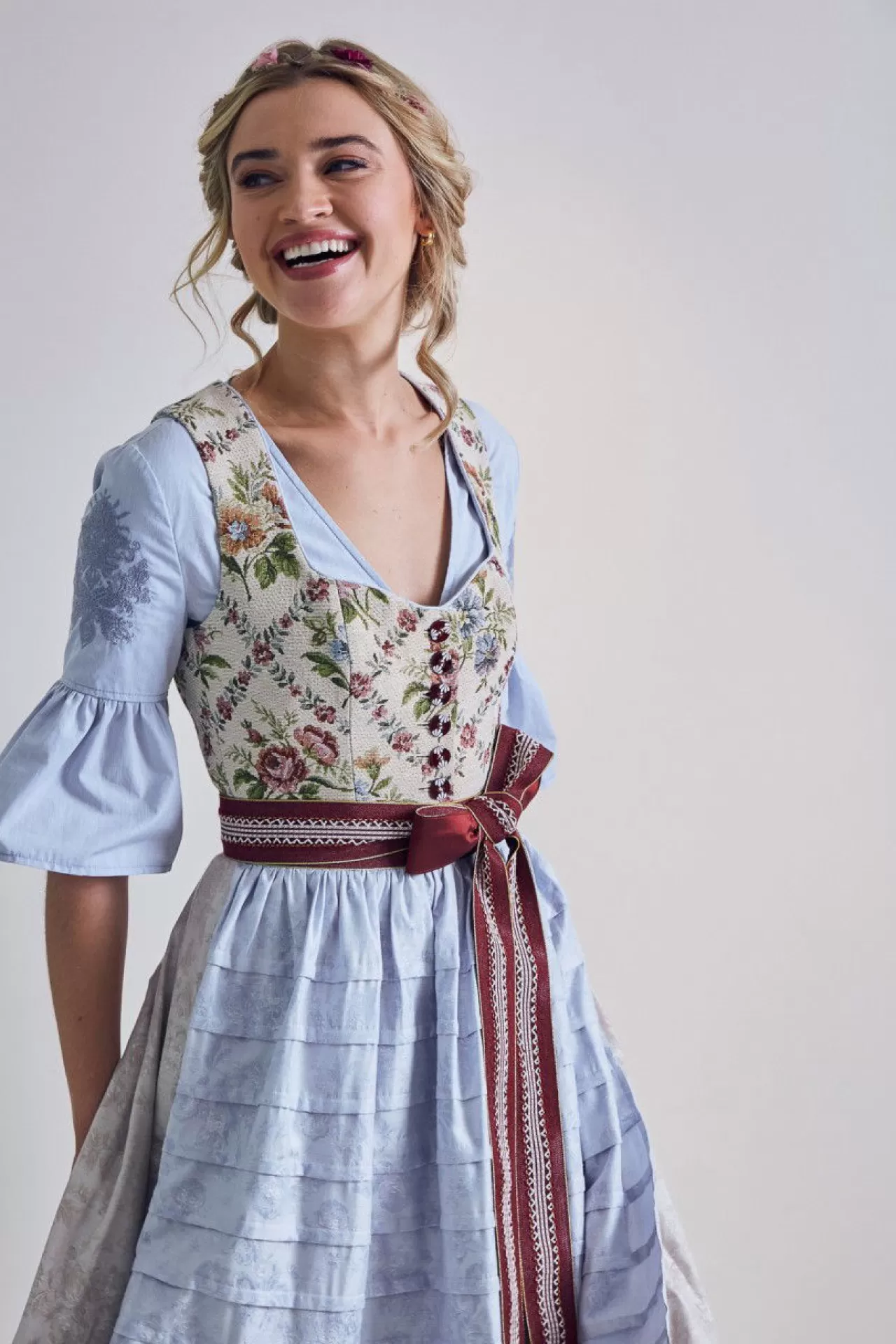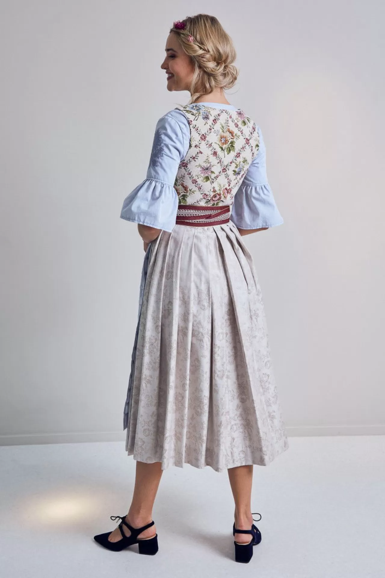 Der Mix aus hochwertigen Materialien mit traditionellen Drucken und liebevollen Details macht dieses Dirndl zu einem wahren Schmuckstück. Das Oberteil mit dem malerischen Druck und dem herzförmigen Ausschnitt, der mit einer Paspel abgesetzt ist, zieht alle Blicke auf sich. In einem harmonischen Kontrast dazu steht der feine Rock, der durch die Falten in der Taille seine wundervolle Weite bekommt. Die außergewöhnliche Schürze mit den gekonnt verteilten Biesen und der malerischen Borte als Schürzenband komplettiert den stilvollen Look. In den Rock ist rechts eine Eingriffstasche eingearbeitet und als Verschluss dient ein Knopfverschluss mit bezaubernden Knöpfen in der vorderen Mitte.