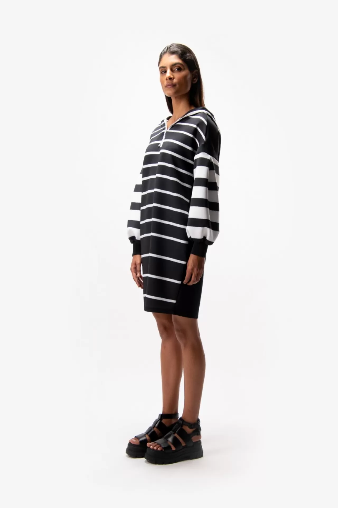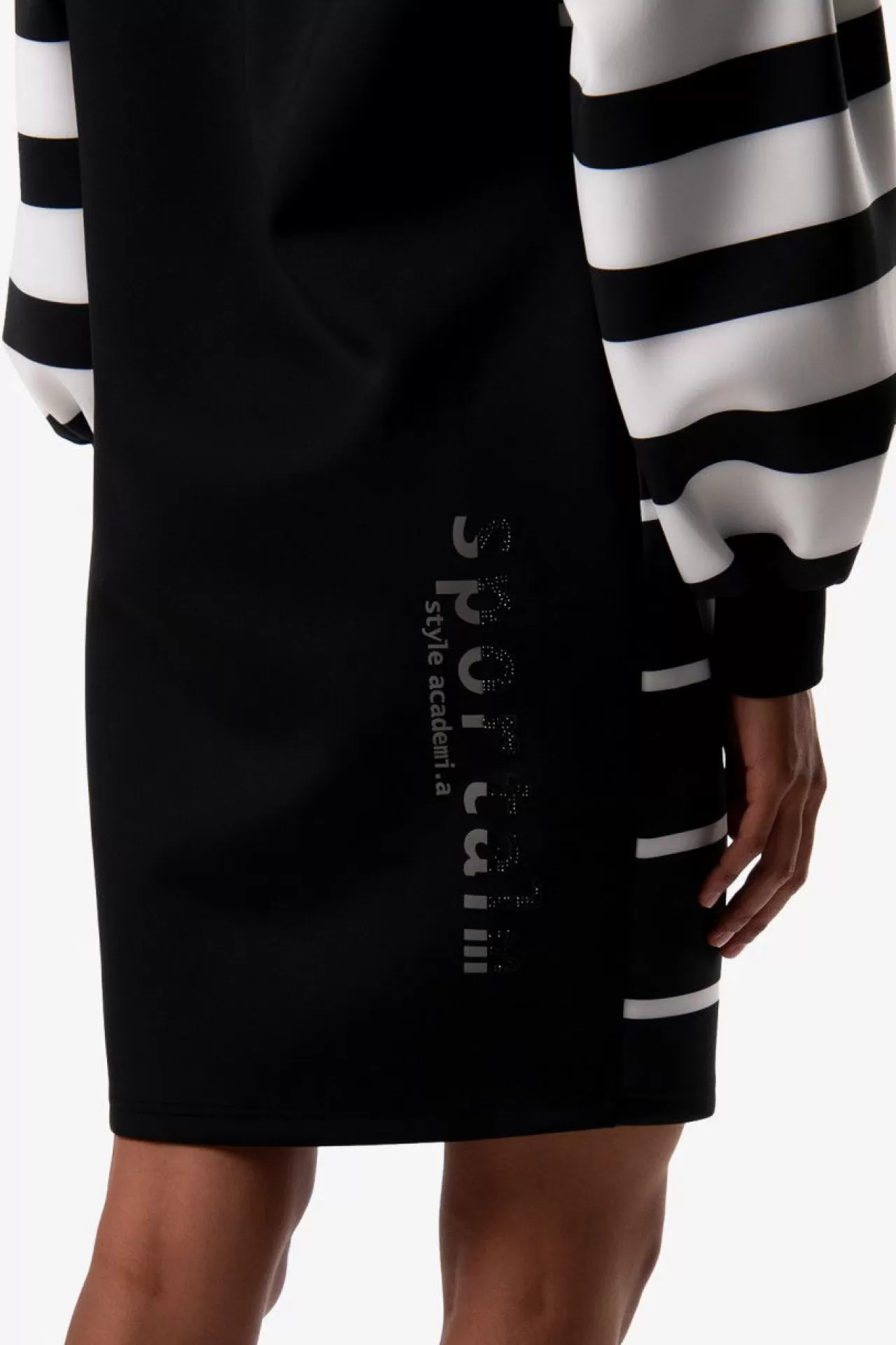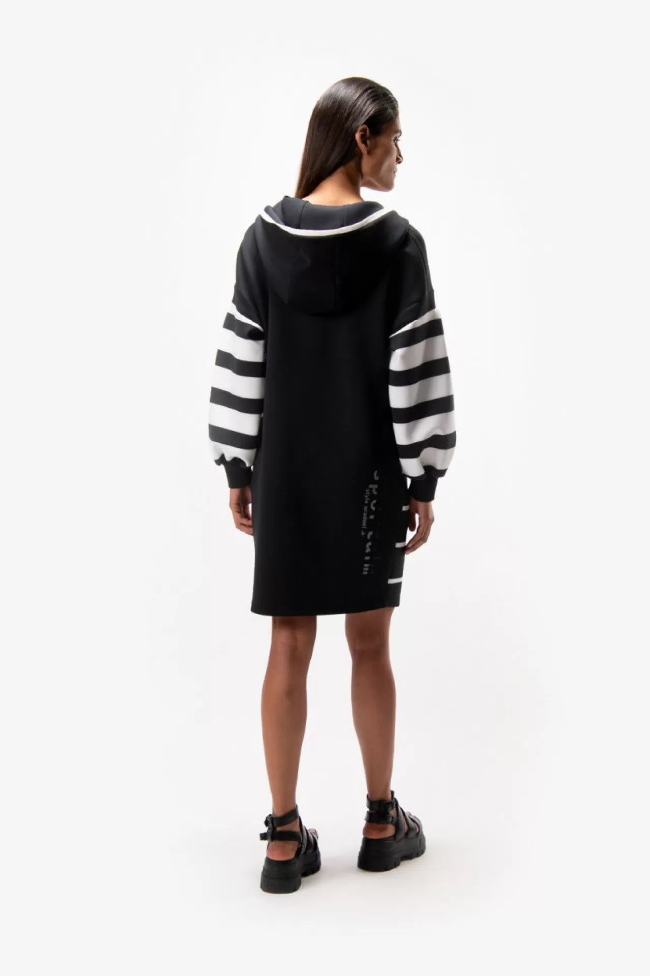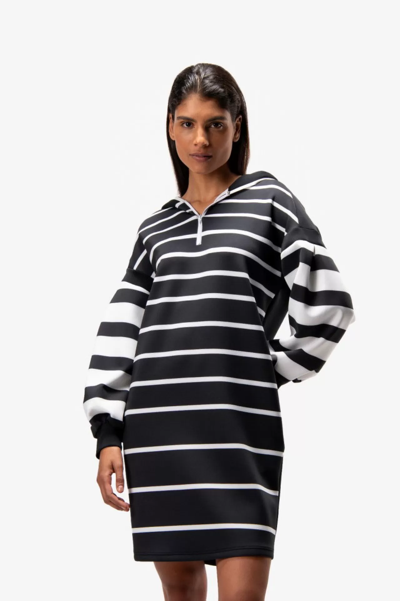 Modische Silhouette: dieses Sweatkleid mit Kapuze aus einer technischen Jersey-Qualität überzeugt durch die raffinierte Silhouette. Sportive durch die Kapuze und dem kurzen Waterproof-Reißverschluss in der vorderen Mitte. Modisch durch die überschnittenen Schultern und die raffinierte Ärmellösung. Edel durch den tonigen Wording-Print aus glitzernden Steinchen im Rückenteil. Auffallend durch die Blockstreifen-Prints. Der Fit: körperumspielend