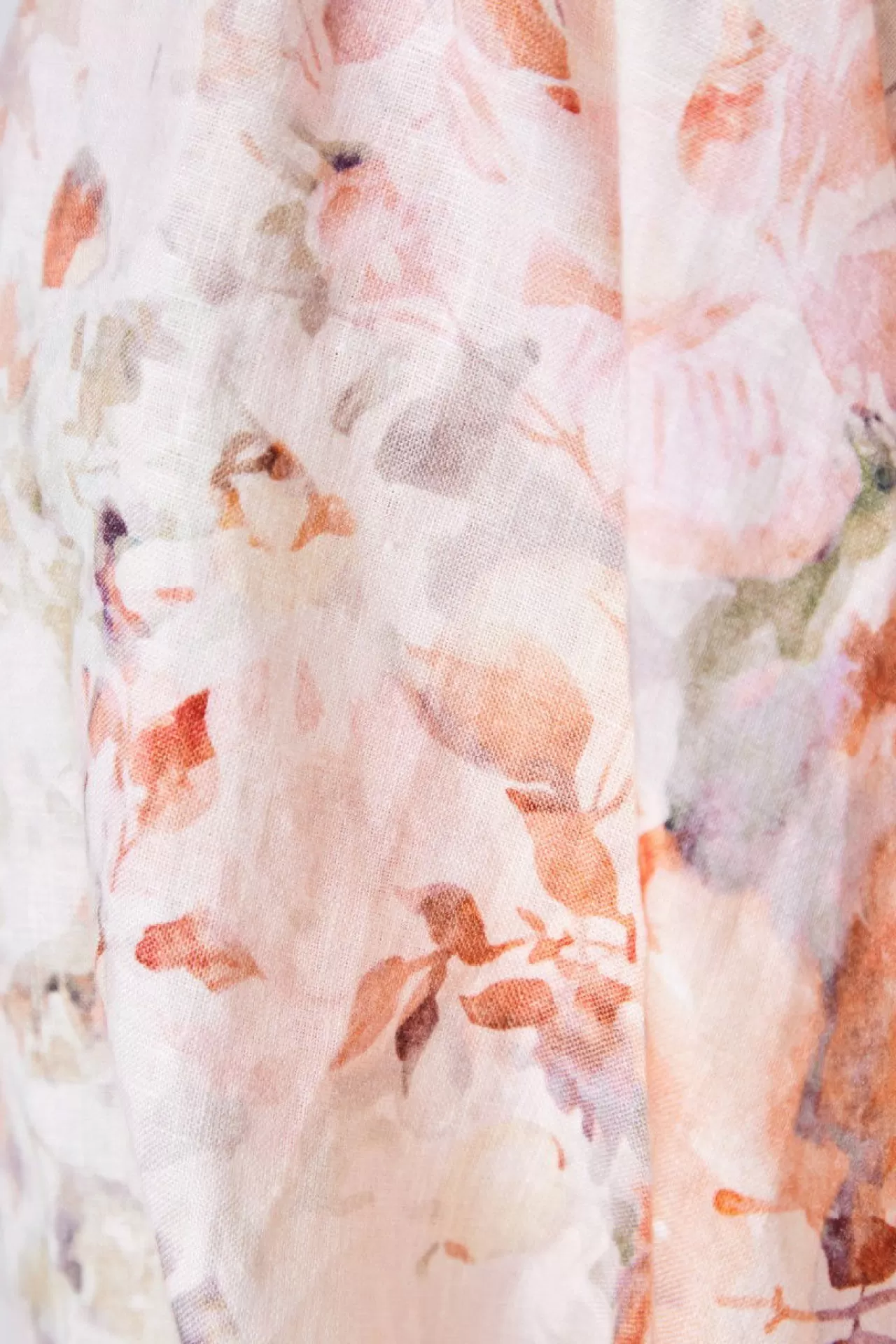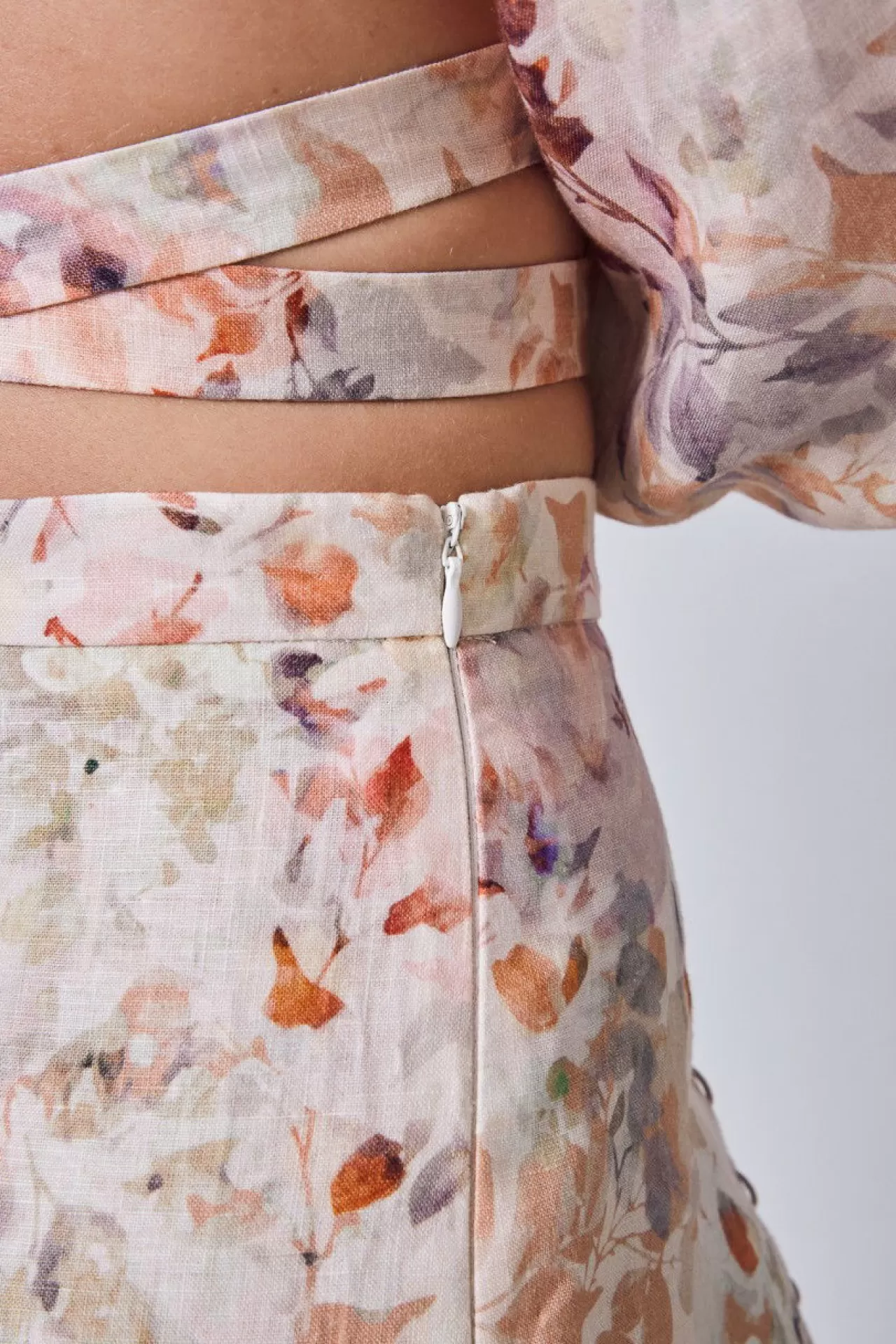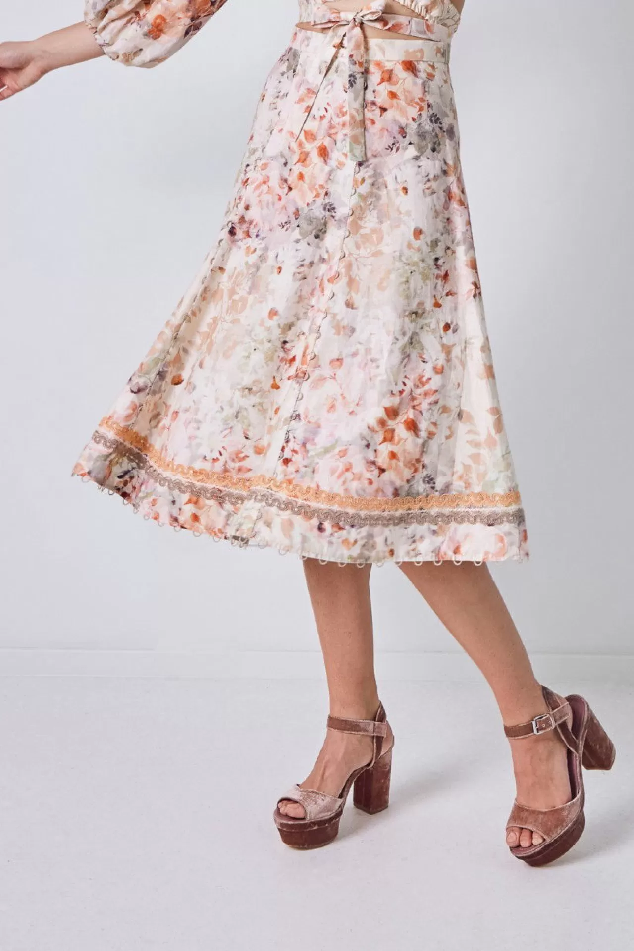 Sommerlich frisch erregt dieser Rock sicherlich Aufsehen. Der feine Leinenstoff mit dem romantischen Blumendruck fühlt sehr angenehm auf der Haut an und engt durch den glockigen Schnitt nicht ein. Verziert ist der Rock am Saum und an den Teilungsnähten mit hochwertigen Borten und Bändern, die farblich perfekt zum Blumendruck passen. Als Verschluss dient in der linken Seitennaht ein nahtfeiner Reißverschluss, der an der Bundoberkante mit einem Glasknopf und einer Satinschlaufe innen gesichert ist.