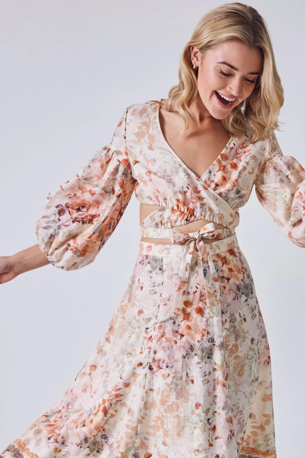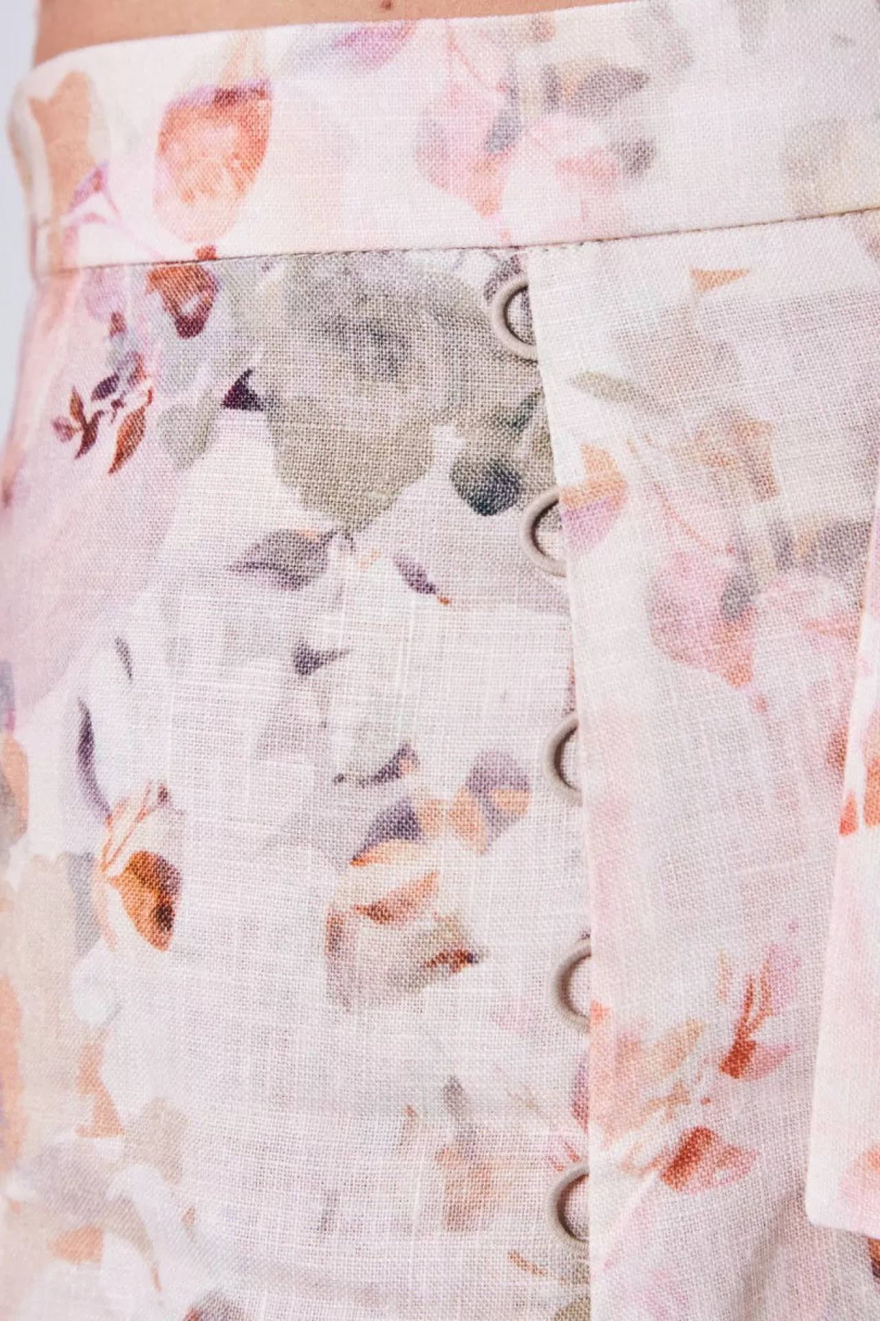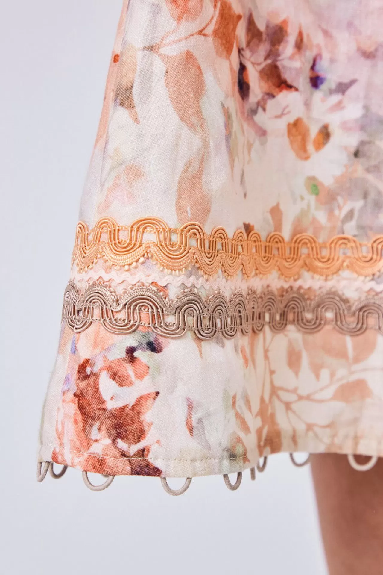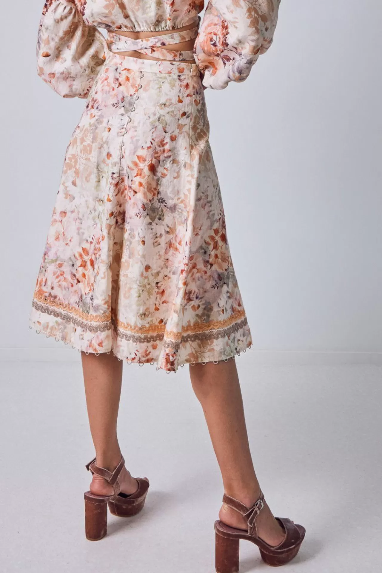 Sommerlich frisch erregt dieser Rock sicherlich Aufsehen. Der feine Leinenstoff mit dem romantischen Blumendruck fühlt sehr angenehm auf der Haut an und engt durch den glockigen Schnitt nicht ein. Verziert ist der Rock am Saum und an den Teilungsnähten mit hochwertigen Borten und Bändern, die farblich perfekt zum Blumendruck passen. Als Verschluss dient in der linken Seitennaht ein nahtfeiner Reißverschluss, der an der Bundoberkante mit einem Glasknopf und einer Satinschlaufe innen gesichert ist.