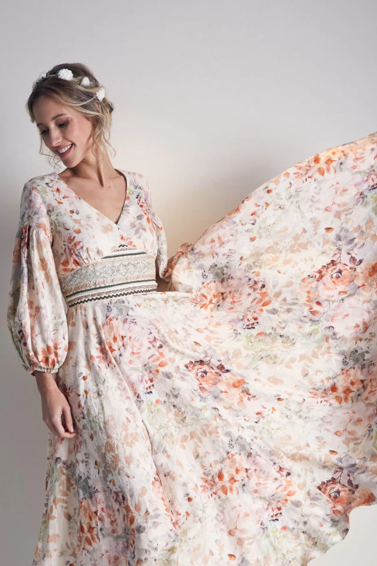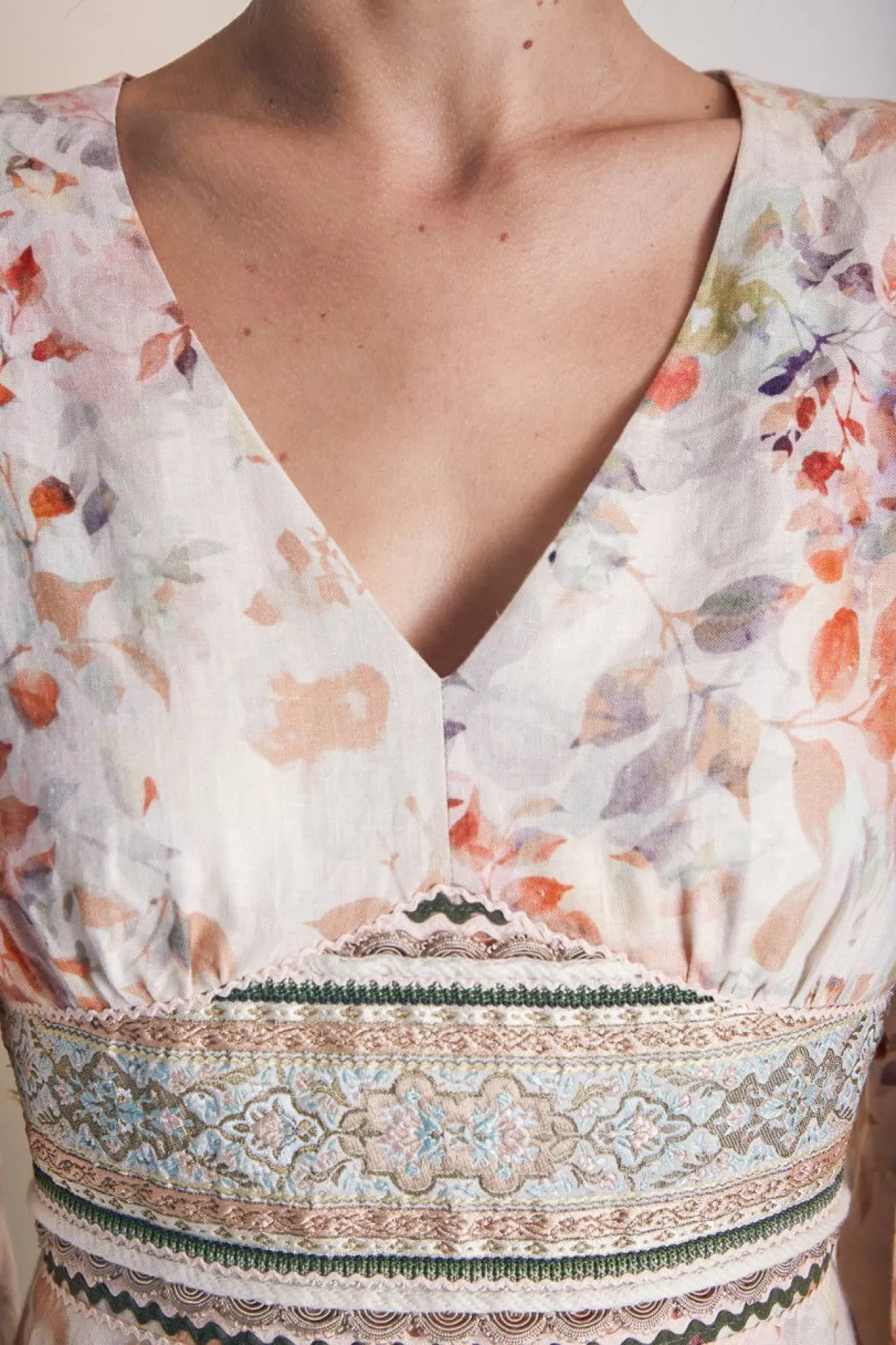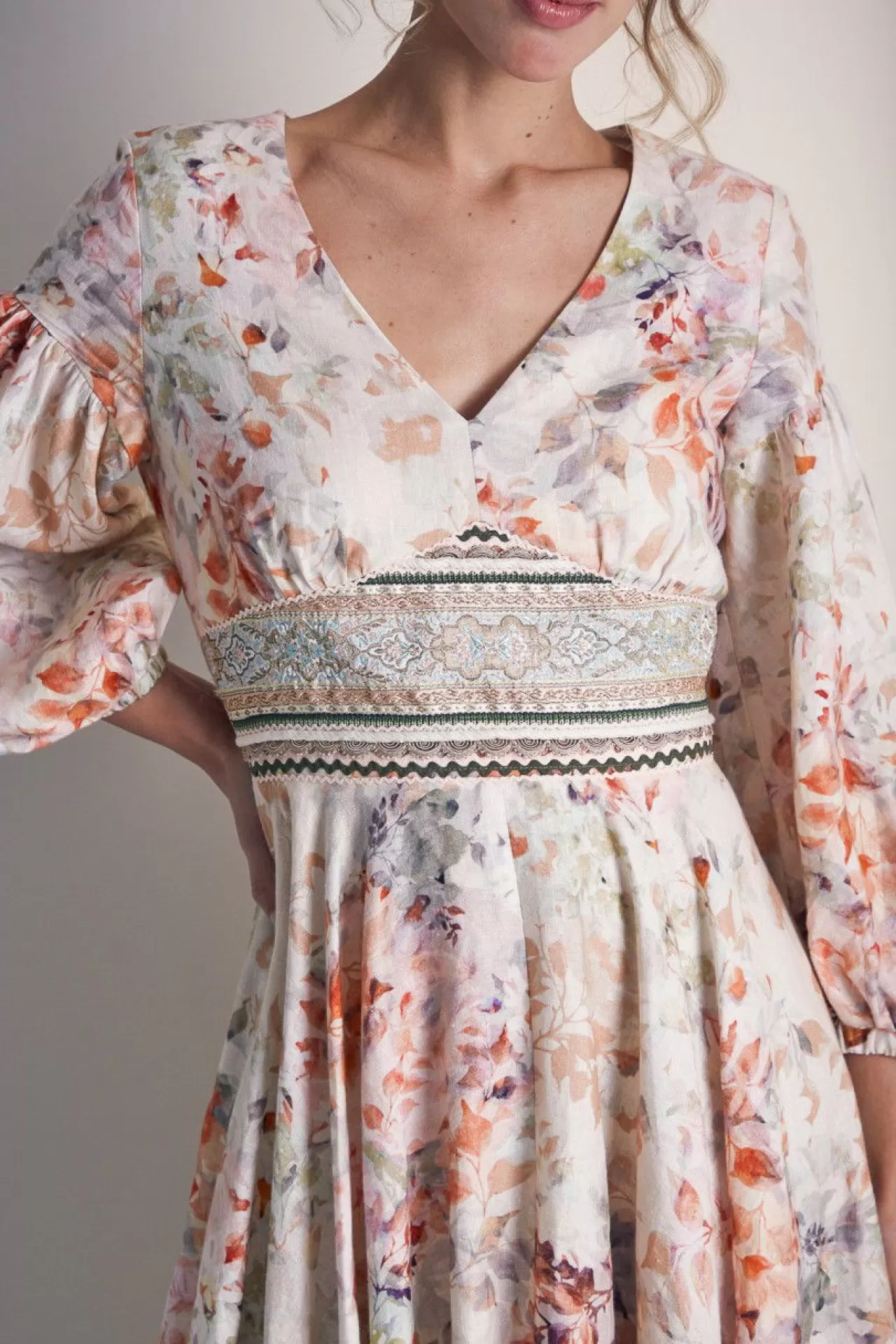 Wer das Besondere sucht, wird dieses Kleid lieben. Die hochwertige Leinen-Qualität mit dem romantischen Blumendruck macht dieses Kleid zu einem Hingucker. Im Vorderteil sind in der Taille prächtige Borten eingearbeitet, die alle Blicke auf sich ziehen. Der feminine V-Ausschnitt passt perfekt zum schmalen Oberteil. Die Ärmel mit der Raffung im Oberarm und am Ärmelsaum unterstreichen den romantischen Look. Der Rock mit der schwingenden Weite hat zwei Nahttaschen in der Seitennaht. Das Kleid ist teilweise gefüttert und durch einen nahtfeinen Reißverschluss in der Rückenmitte bequem anzuziehen.