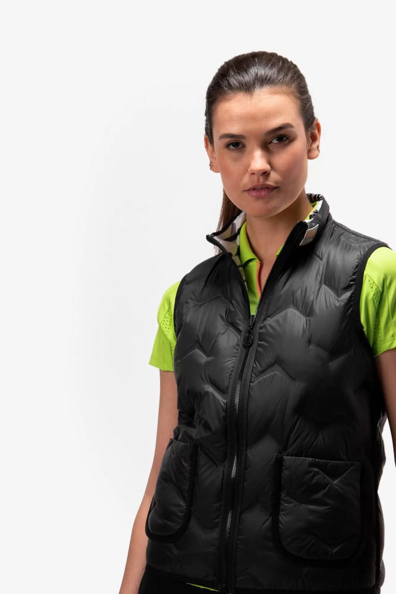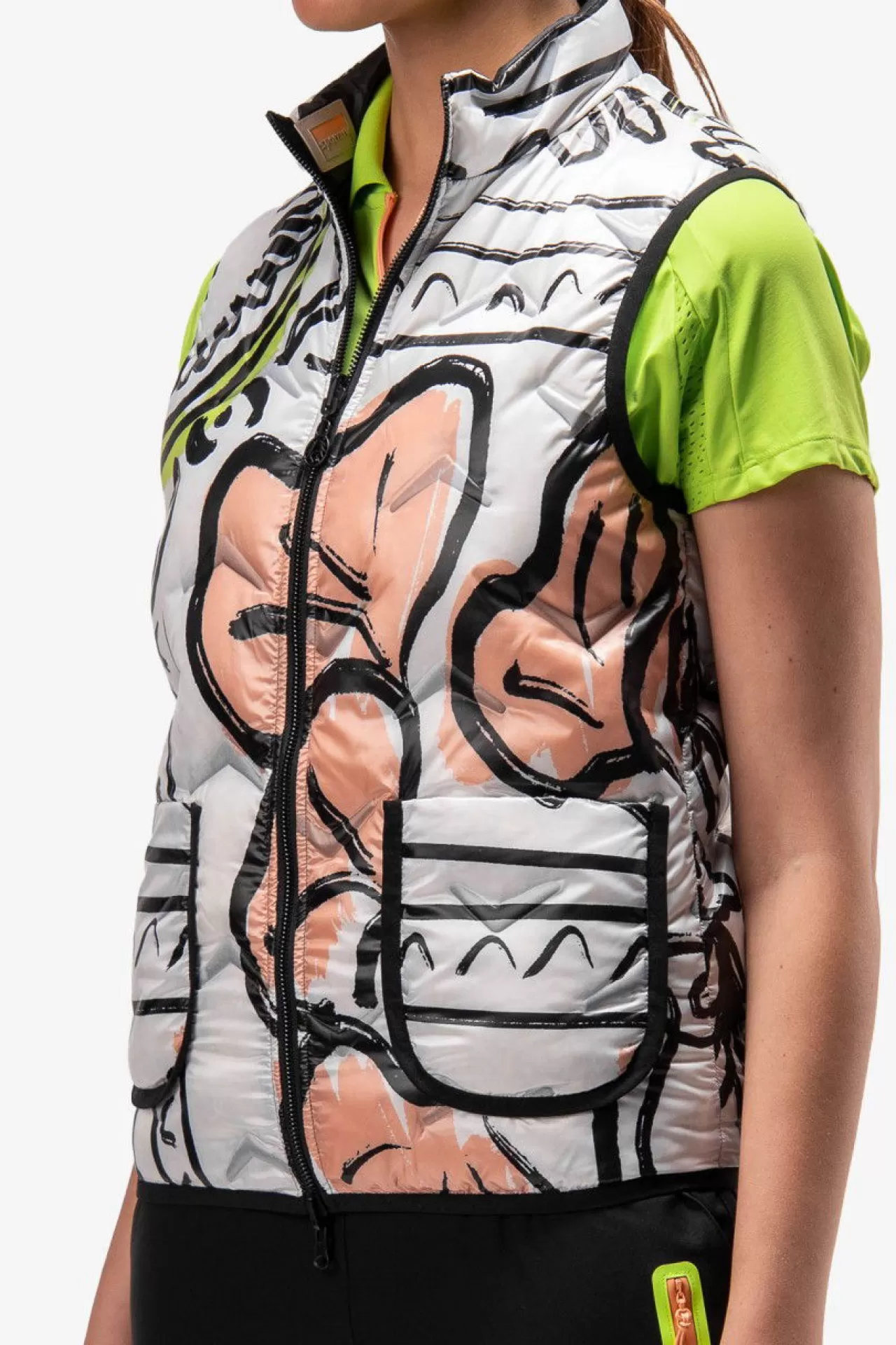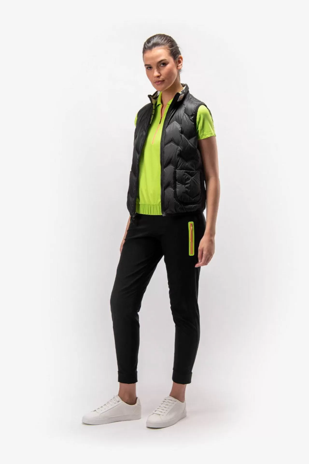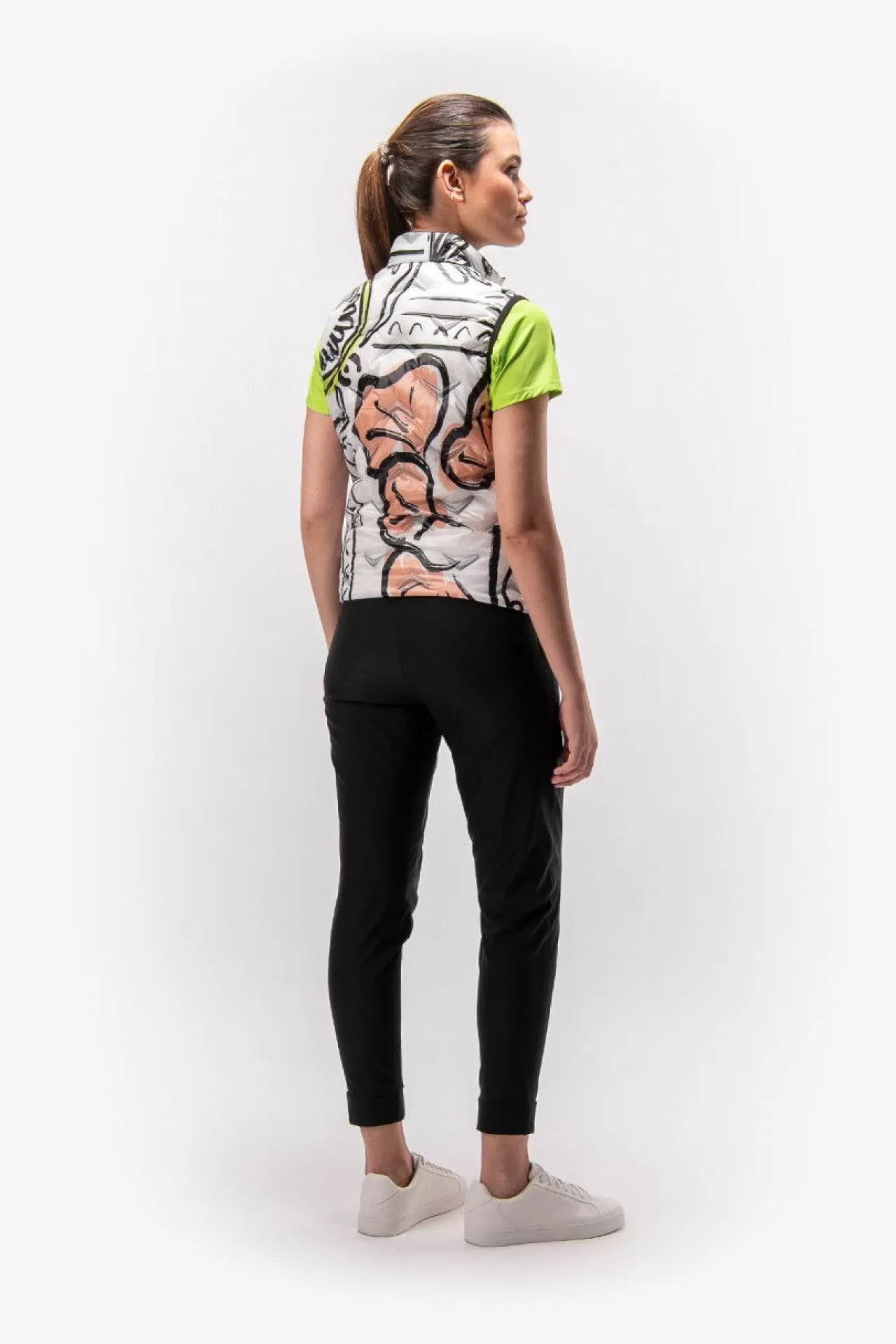 Ob auffallend bunt oder dezent einfarbig gehalten – diese lockere, wattierte Wendejacke mit dem geprägten Zackenmotiv darf in keinem Kleiderschrank fehlen. Eine Seite ist mit einem exklusiven Allover-Print von Sportalm bedruckt, der alle Blicke auf sich zieht. Im Vorderteil sind zwei Taschen aufgesetzt, die Platz für die wichtigen Kleinigkeiten bieten. Die zweite Seite ist in einem schlichten Schwarz gehalten, wodurch die Weste zu einem perfekten Kombiteil wird. Auch hier sind wieder zwei Taschen im Vorderteil aufgesetzt. Am Stehkragen ist hier ein hochwertigen Sportalm-Silikon-Badge platziert. Die Armlöcher sind mit einem elastischen Falzgummi eingefasst. Als Verschluss ist ein wendbarer Metallux-Reißverschluss sichtbar in der vorderen Mitte eingearbeitet.