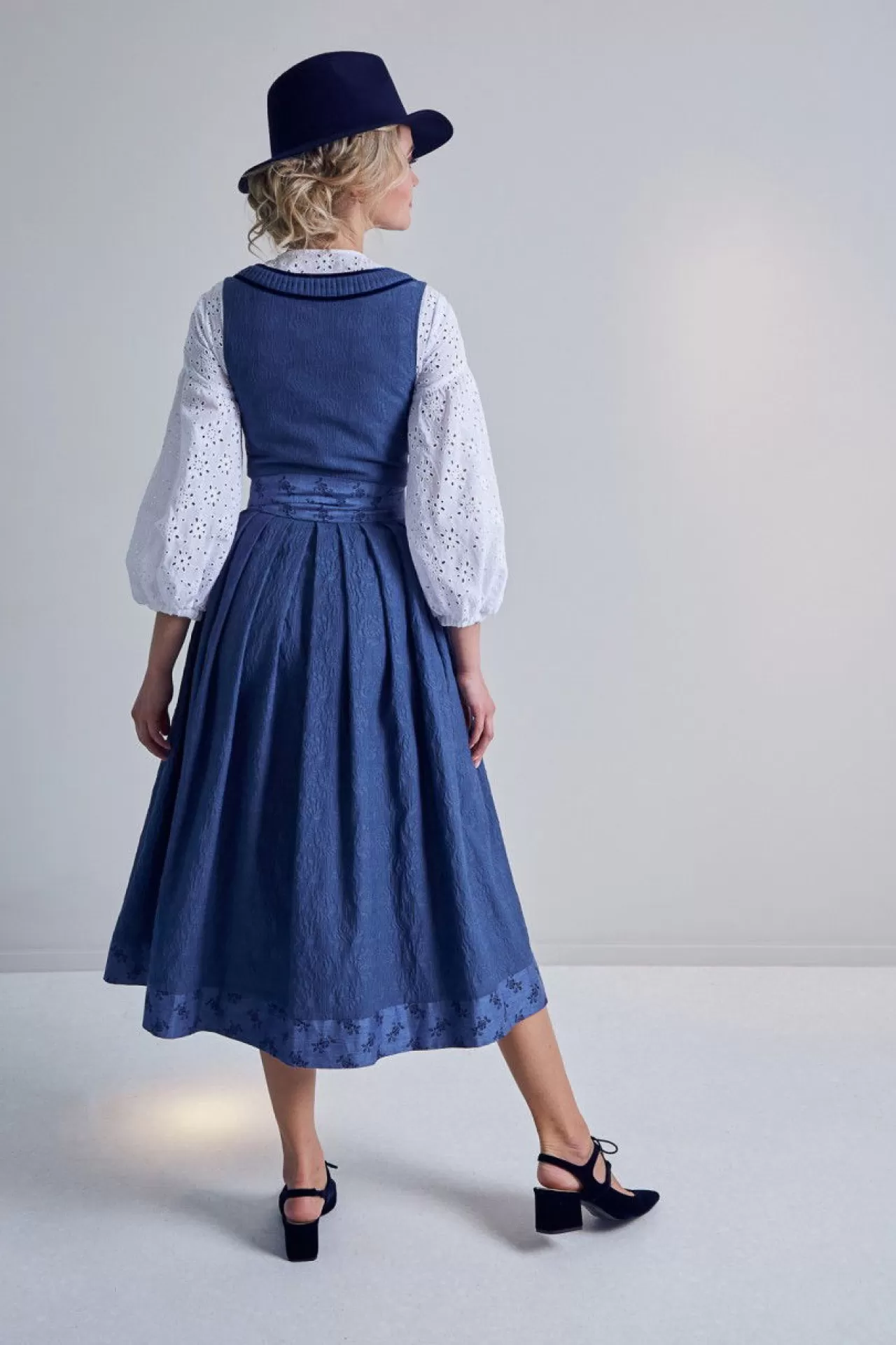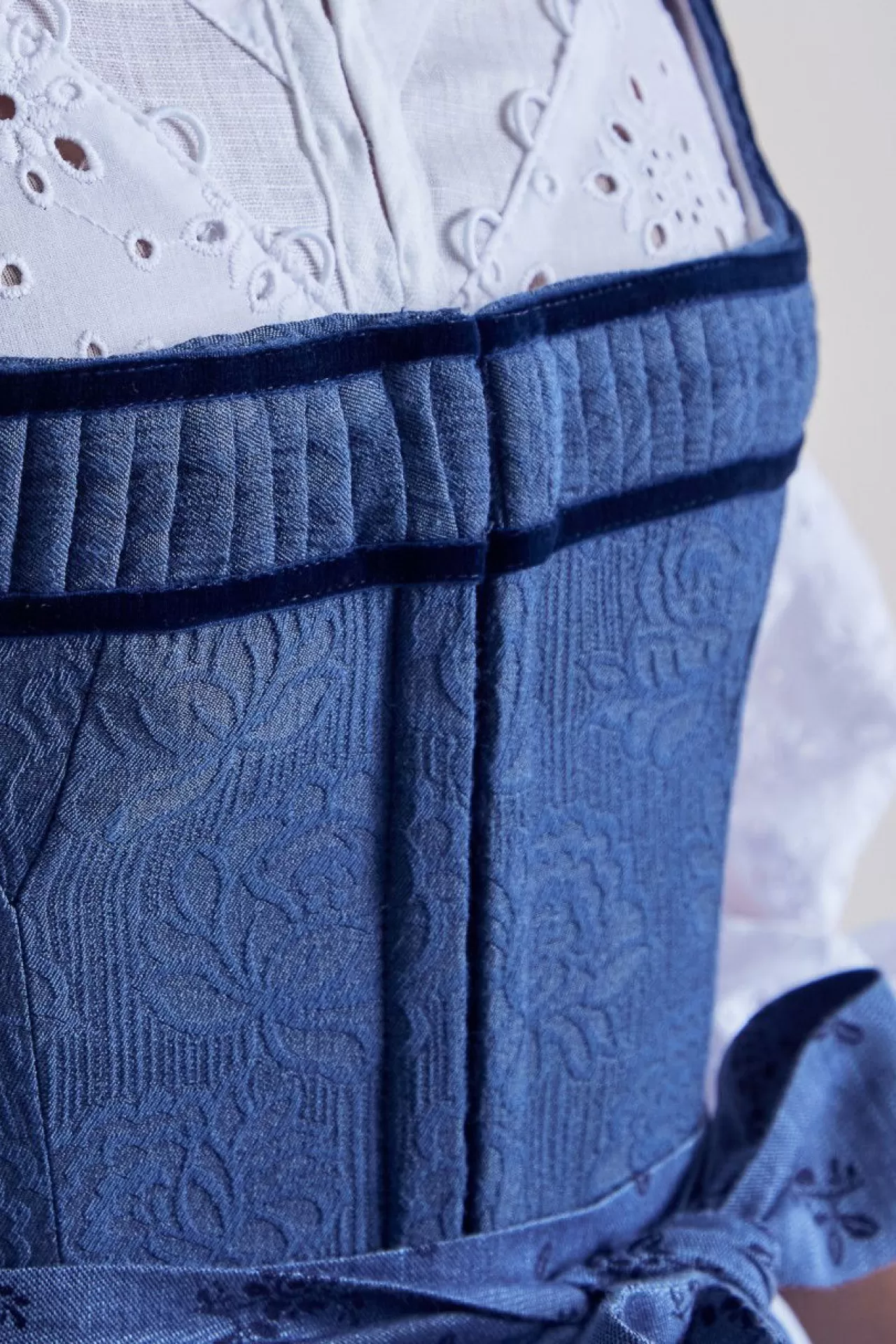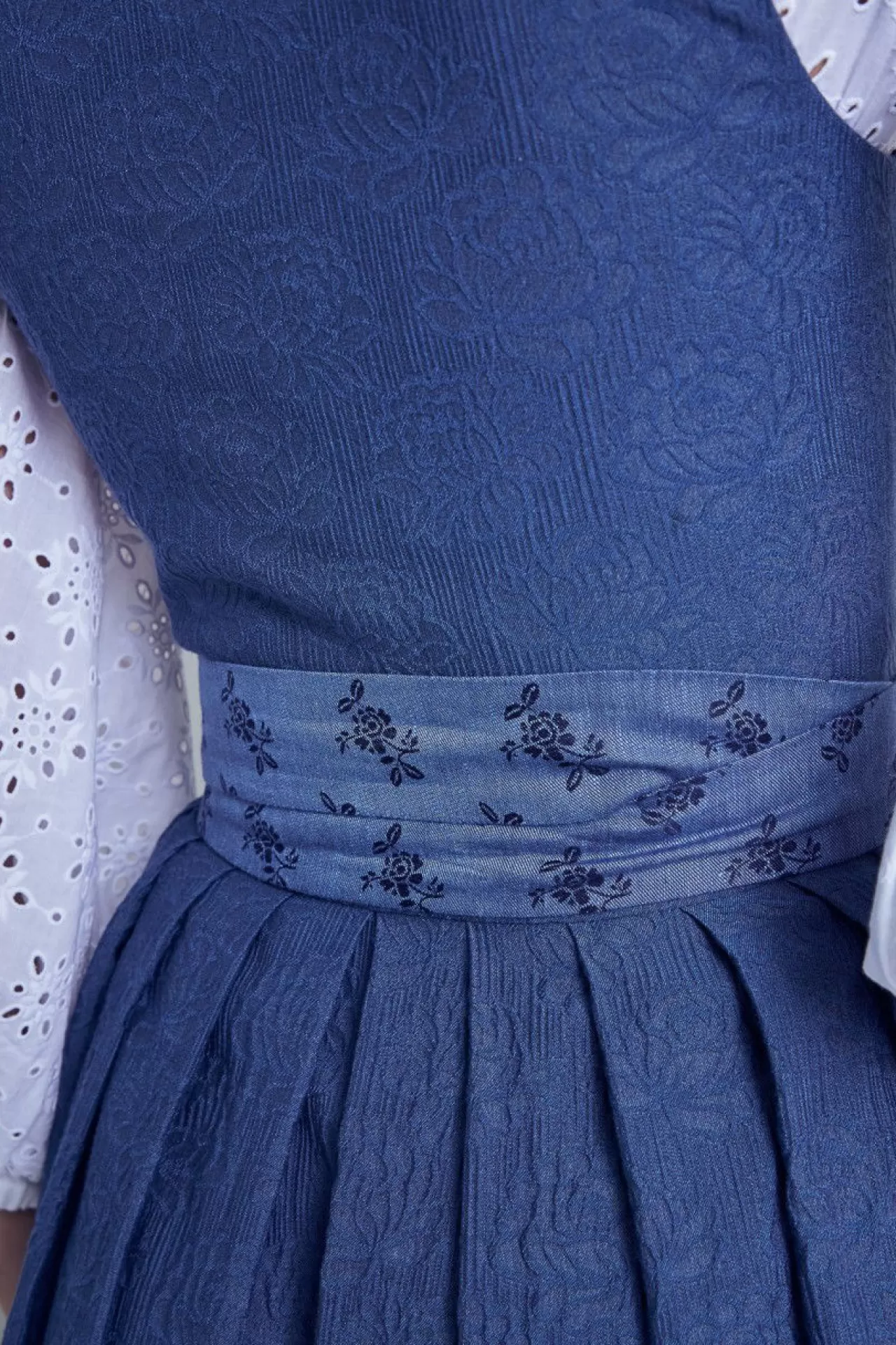 Außergewöhnlich und facettenreich präsentiert sich dieses Dirndl. Das hochwertige, feine Strukturmuster in Oberteil und Rock bringt fühlt sich sehr angenehm auf der Haut an. Auffallend ist der Ausschnitt mit den liebevoll gelegten Falten und der hochwertigen Borte an den Kanten. Der Rock ist in Falten gelegt und erhält dadurch seine wunderbare Weite. Den Saum ziert ein breiter Besatz mit einem zarten Blumenmuster. Die einfarbige Schürze ist perfekt auf das Dirndl abgestimmt und als Schürzenband findet sich das zarte Blumenmuster wieder. Den Schürzensaum bringt eine Fransenborte perfekt zur Geltung. Zusätzlich kann das Dirndl auch mit dem Gürtel aus malerischen Borten getragen werden. Im Gürtel ist im Rücken ein Knopfverschluss mit überzogenen Knöpfen eingearbeitet. Als Verschluss dient in der vorderen Mitte ein Hakenverschluss. In den Rock ist rechts eine Eingriffstasche eingearbeitet und als Verschluss dient ein unsichtbarer Hakenverschluss in der vorderen Mitte.