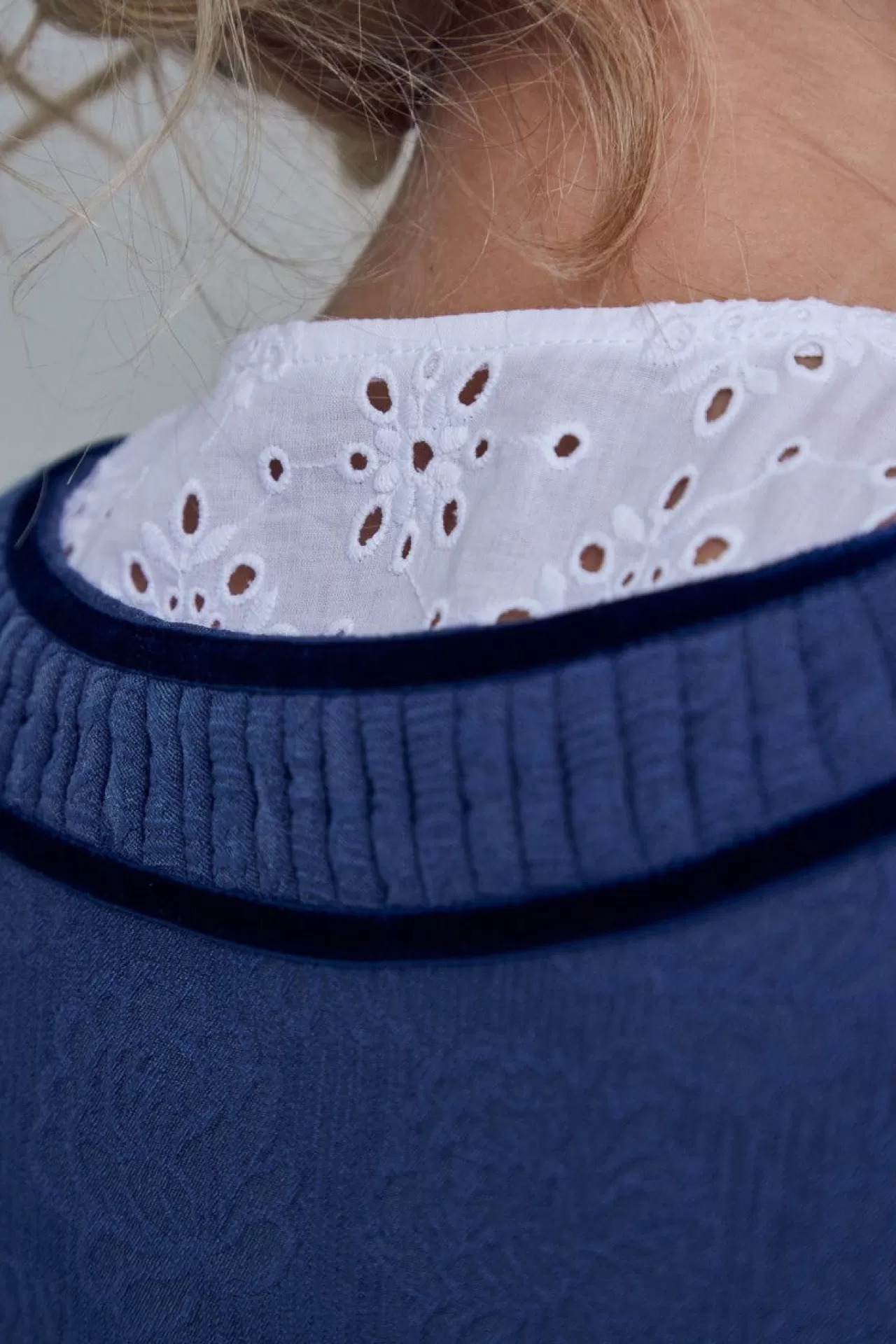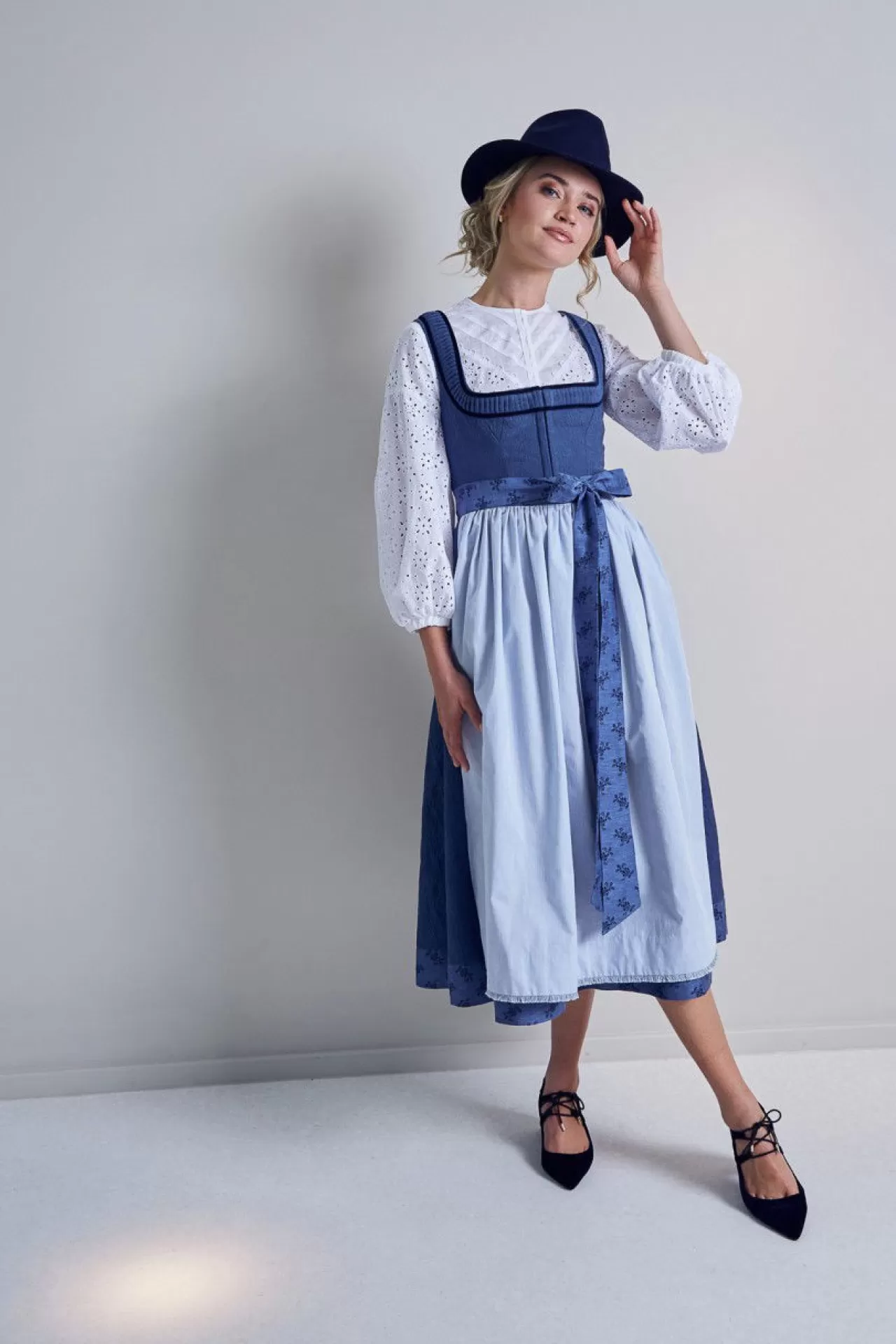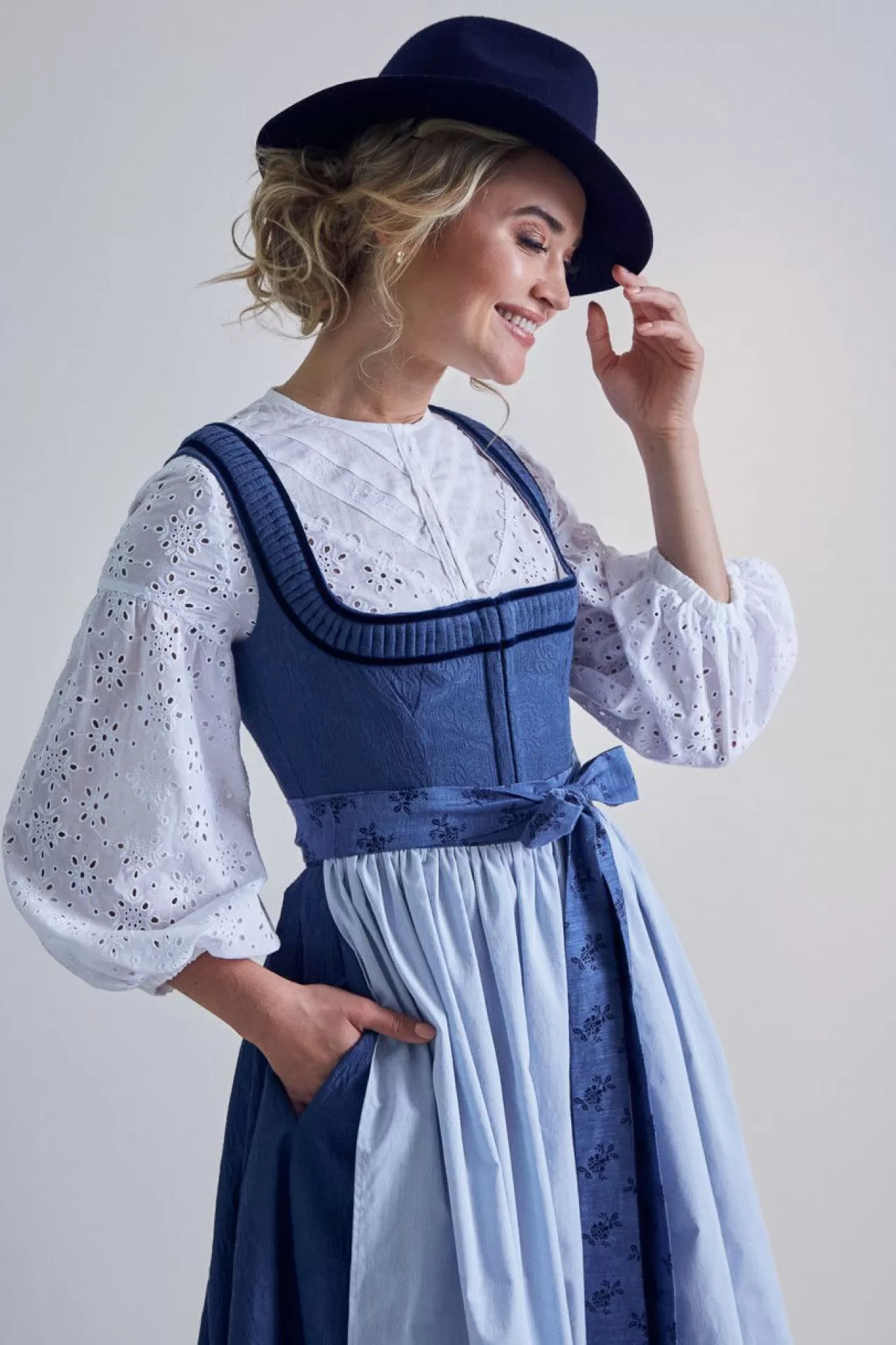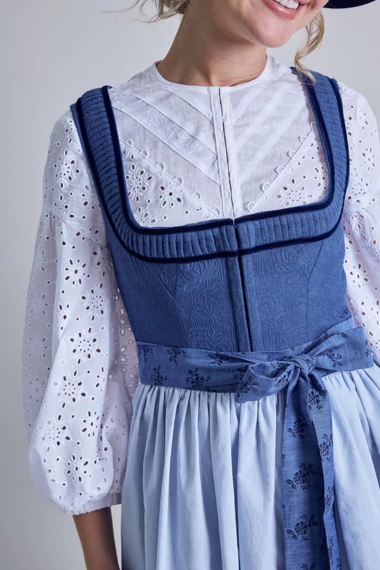 Außergewöhnlich und facettenreich präsentiert sich dieses Dirndl. Das hochwertige, feine Strukturmuster in Oberteil und Rock bringt fühlt sich sehr angenehm auf der Haut an. Auffallend ist der Ausschnitt mit den liebevoll gelegten Falten und der hochwertigen Borte an den Kanten. Der Rock ist in Falten gelegt und erhält dadurch seine wunderbare Weite. Den Saum ziert ein breiter Besatz mit einem zarten Blumenmuster. Die einfarbige Schürze ist perfekt auf das Dirndl abgestimmt und als Schürzenband findet sich das zarte Blumenmuster wieder. Den Schürzensaum bringt eine Fransenborte perfekt zur Geltung. Zusätzlich kann das Dirndl auch mit dem Gürtel aus malerischen Borten getragen werden. Im Gürtel ist im Rücken ein Knopfverschluss mit überzogenen Knöpfen eingearbeitet. Als Verschluss dient in der vorderen Mitte ein Hakenverschluss. In den Rock ist rechts eine Eingriffstasche eingearbeitet und als Verschluss dient ein unsichtbarer Hakenverschluss in der vorderen Mitte.