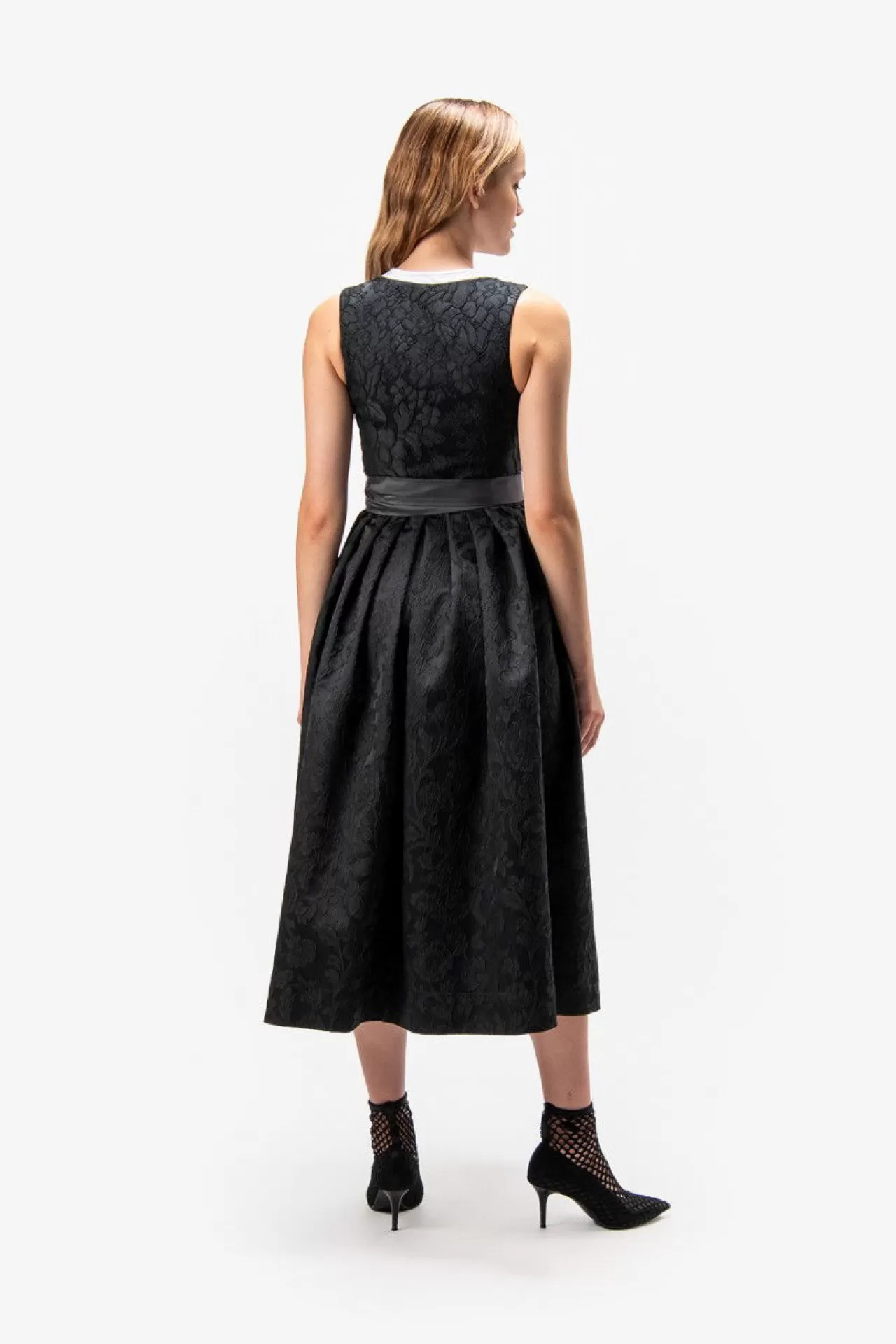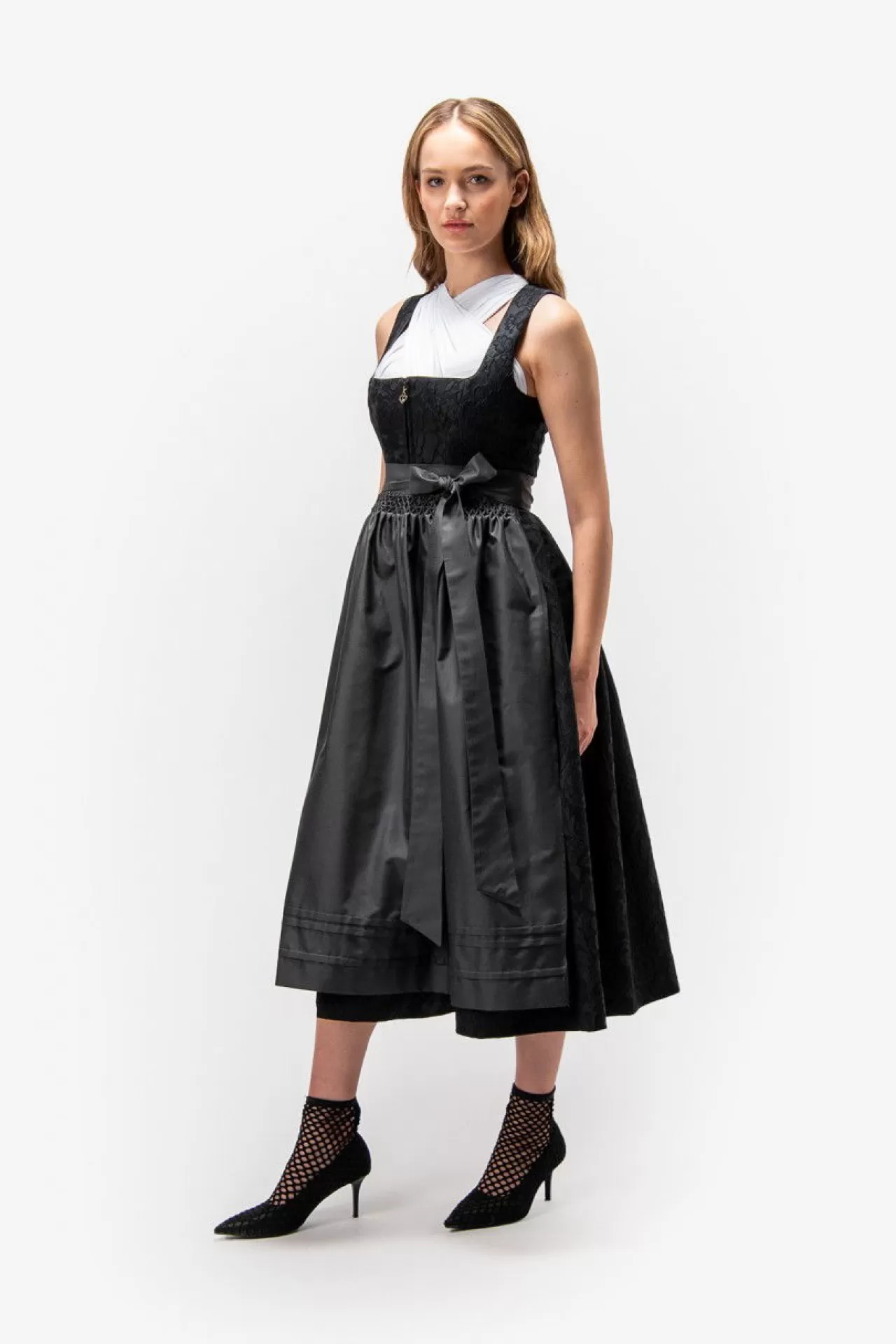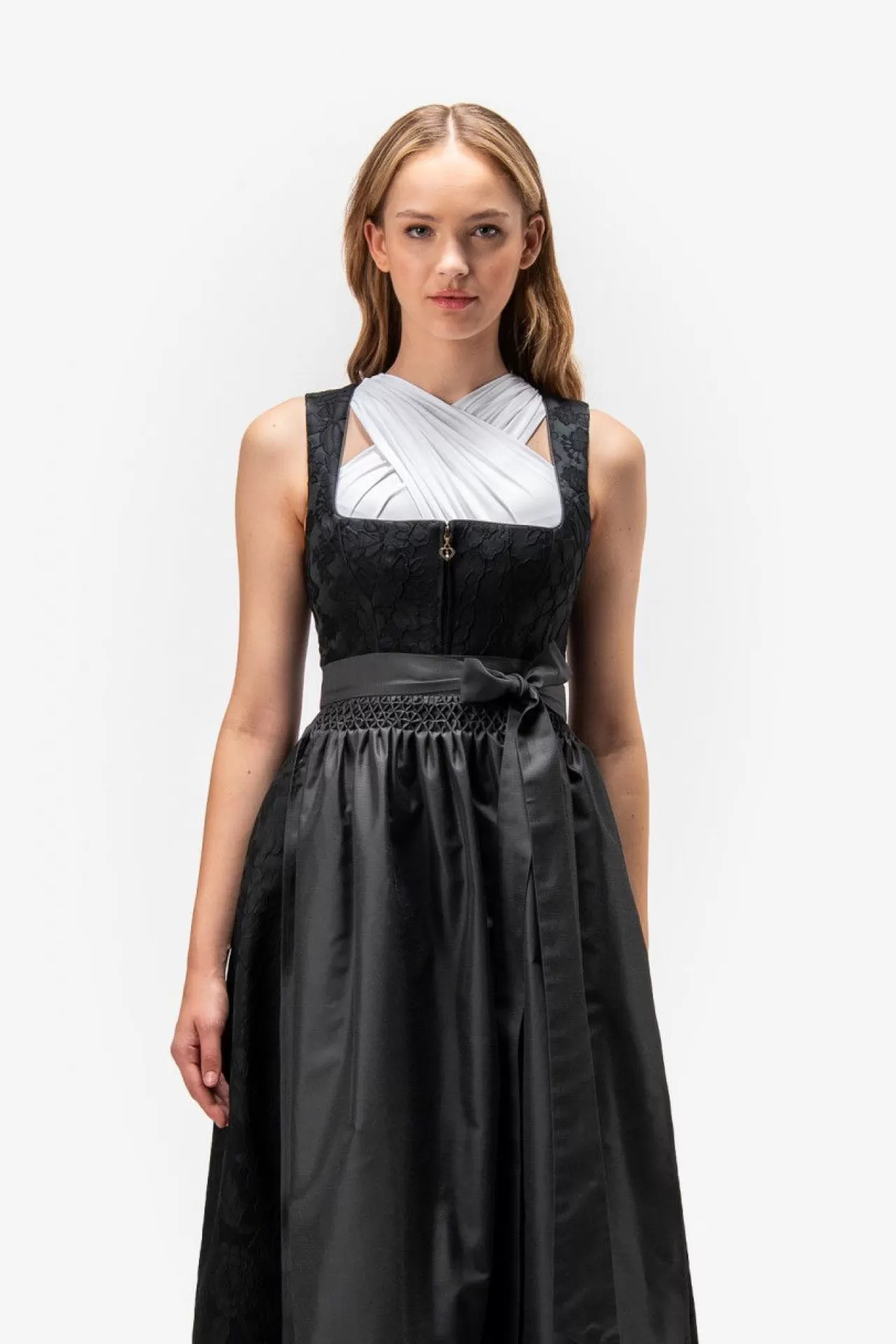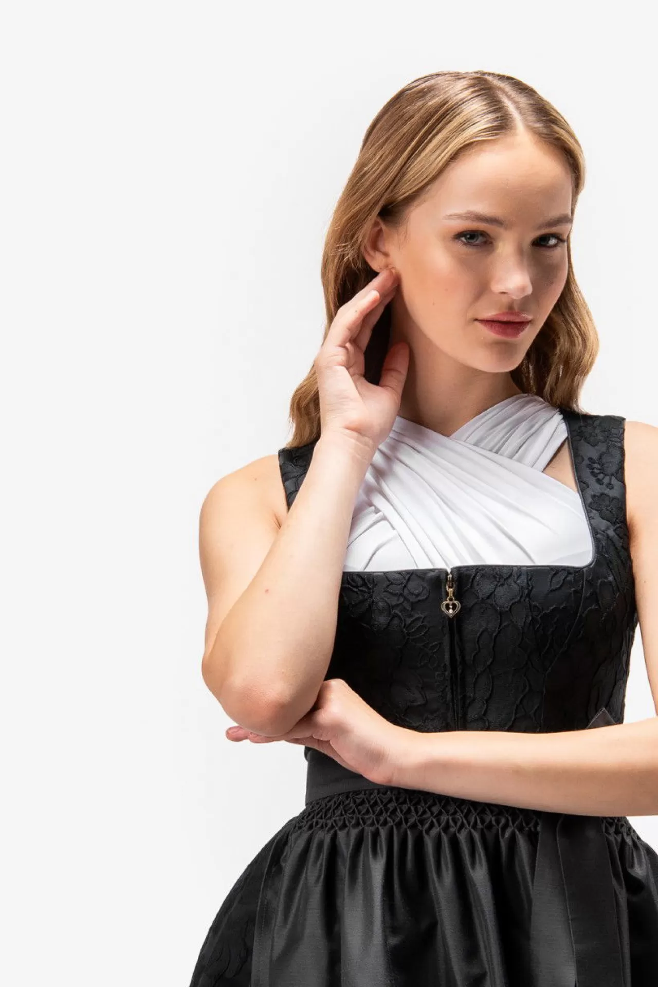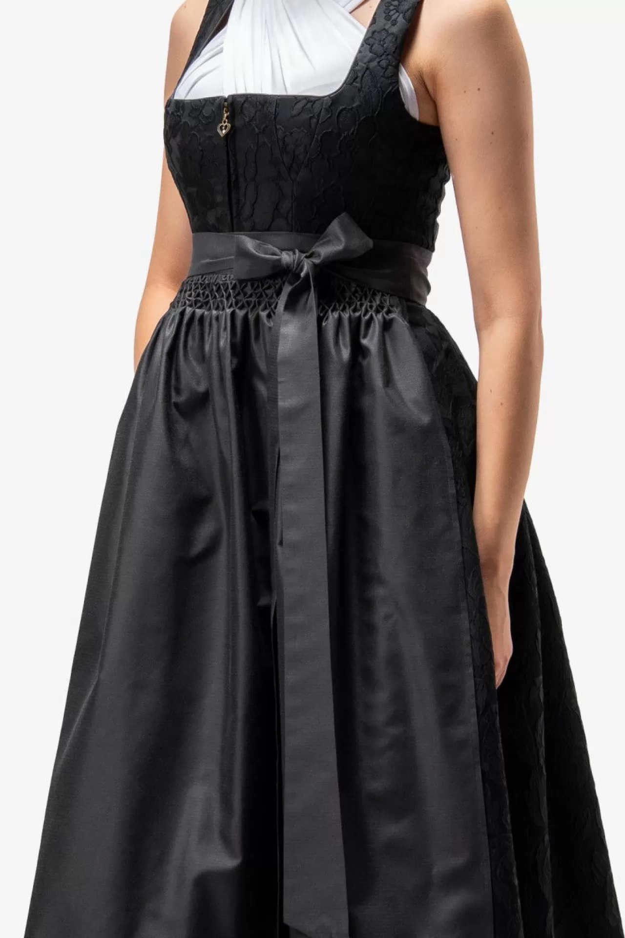 Unser bezauberndes Dirndl vereint exzellentes Handwerk mit zeitloser Eleganz. Das hochwertige Blumen-Jacquard-Oberteil harmoniert perfekt mit dem kunstvoll gestalteten 3-D-Jacquard-Rock, der in kunstvollen Falten gelegt ist. Die einfarbige Schürze, kunstvoll gestaltet mit aufwendiger Handarbeit und einem zarten Säumchen am Saum, fügt eine subtile Raffinesse hinzu. Der Reißverschluss in der vorderen Mitte ist mit einem herzförmigen Anhänger verziert, der dem Gesamtbild eine romantische Note verleiht.